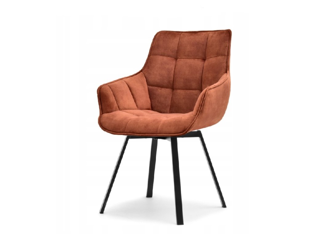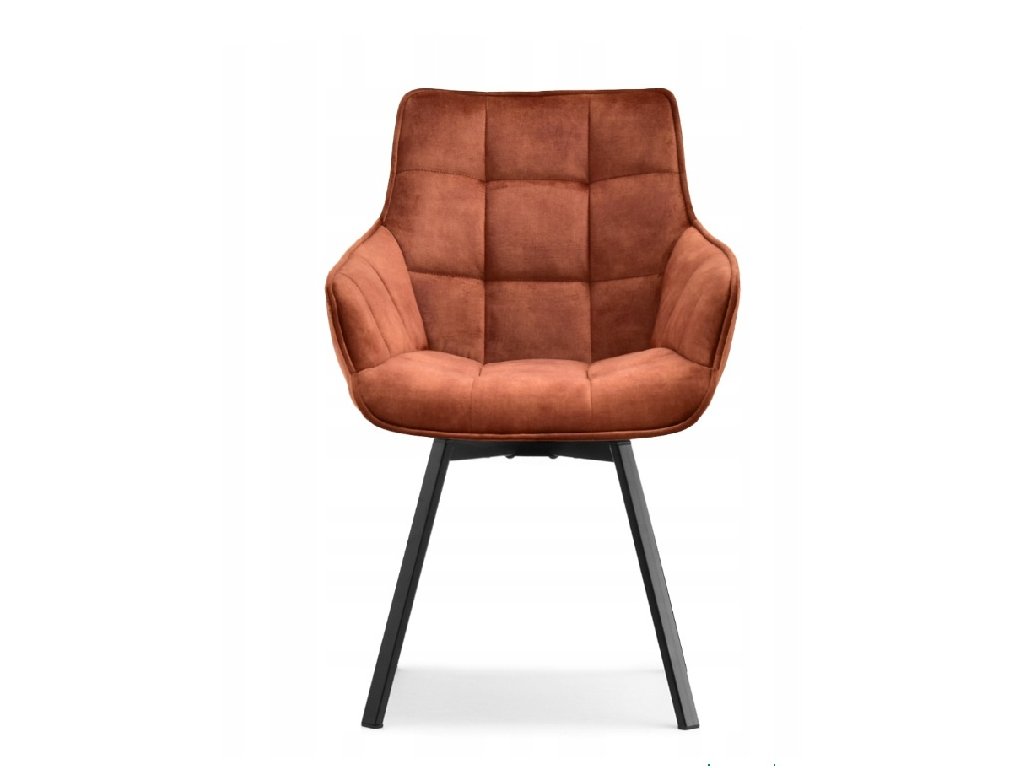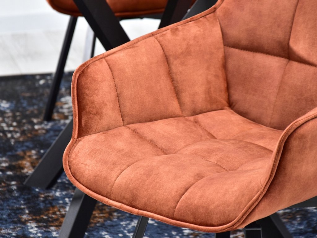 Měděný velur působí teple, elegantně a dodává interiéru jemný akcent. Je měkký na dotek a vytváří útulný vzhled v každém moderním i klasickém prostoru. Prošití sedáku, opěráku a vnitřních područek do pravidelných čtverců dodává židli strukturu a charakter. Černé kovové podnoží tvoří výrazný, moderní kontrast a skvěle ladí ke stolům v různých dekorech.