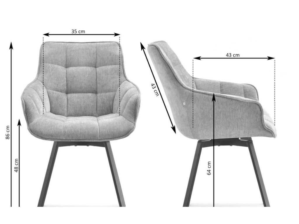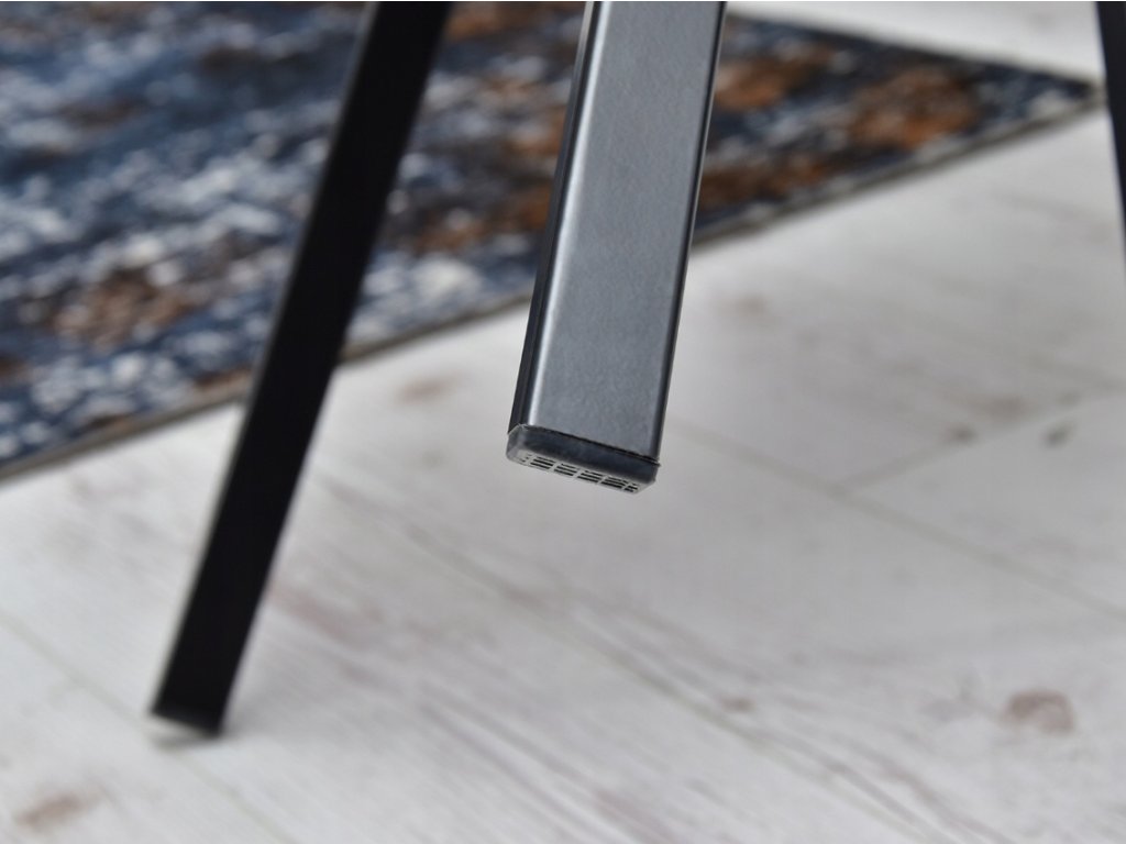 Židle Aruba má stabilní kovovou konstrukci v jednom kuse s otočnou základnou pod sedákem. Díky otočné funkci se židle pohodlně otočí bez nutnosti odsouvání — praktické řešení do menších i běžných prostor. Výška sedu je 48 cm, což je vyšší hodnota než u většiny jídelních židlí a poskytuje velmi komfortní a pevné sezení. Spodní části kovových nohou mají plastové kluzáky, které chrání podlahu před poškrábáním.
