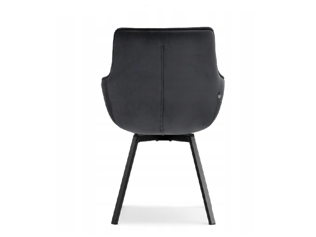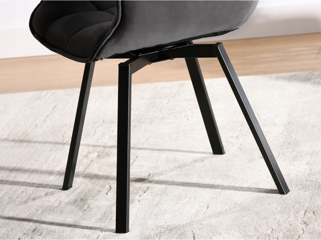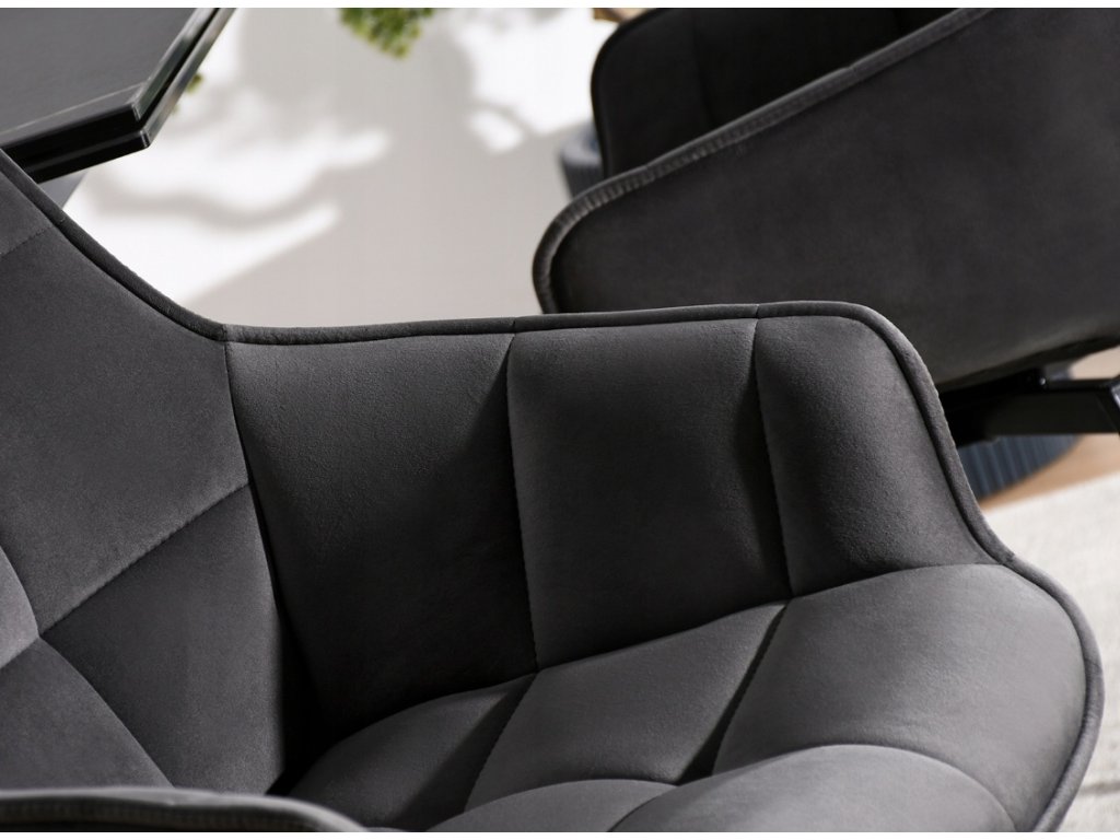 Tmavě šedý velur působí elegantně, je měkký na dotek a vytváří útulný vzhled v každém interiéru. Ozdobné prošití na sedáku, opěráku a vnitřních područkách dodává židli jemnou strukturu a nadčasový detail. Černé kovové podnoží tvoří moderní a praktickou kombinaci vhodnou k většině jídelních stolů i stylů zařízení.
