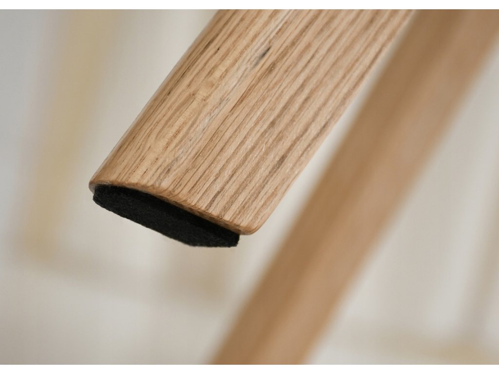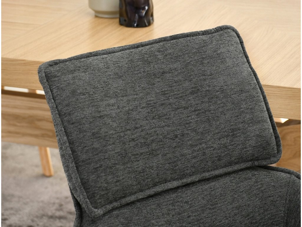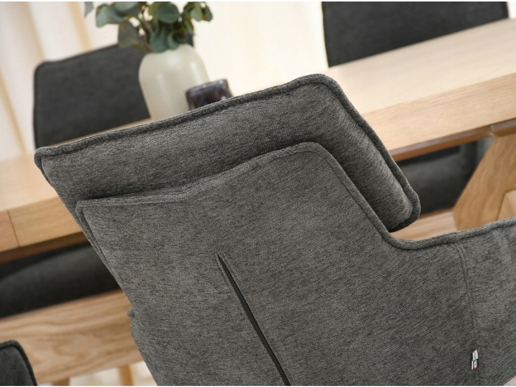 Jídelní židle Dorian kombinuje grafitové čalounění s příjemnou strukturou látky a dubové podnoží v přírodní barvě. Sedák i opěrák mají měkké čalounění a lehce zaoblené linie, které vytvářejí pohodlný a útulný vzhled. Korpus sedáku je ozdobně lemovaný jemnou paspulkou. Na zadní straně je viditelný zip, který slouží pro technologii potažení židle a není určen k sundavání potahu.