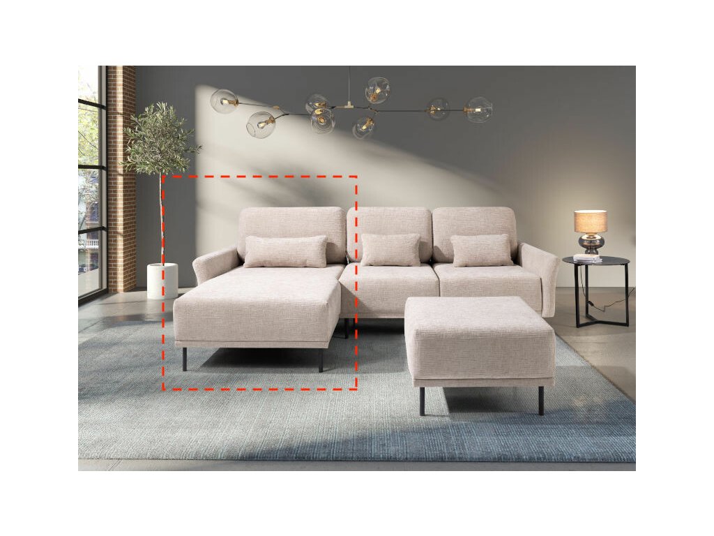 Otoman s područkou na levé straně je určený k zakončení sedací soupravy ve tvaru L či U. Z čelního pohledu na sedací soupravu patří otoman na levou stranu.