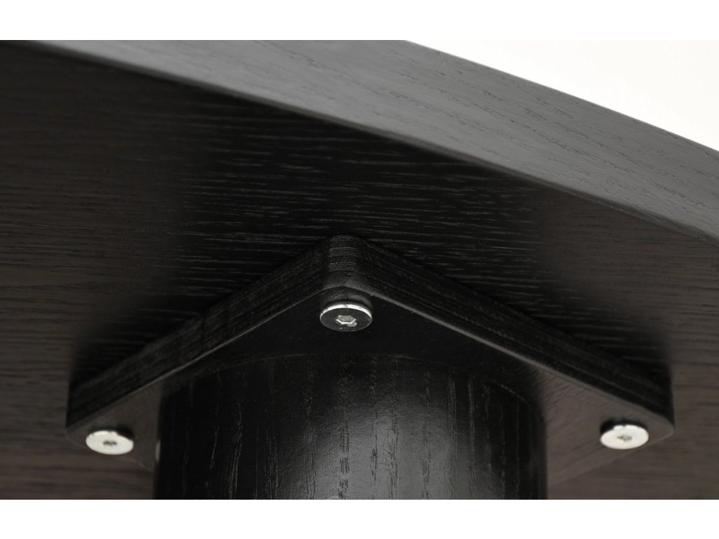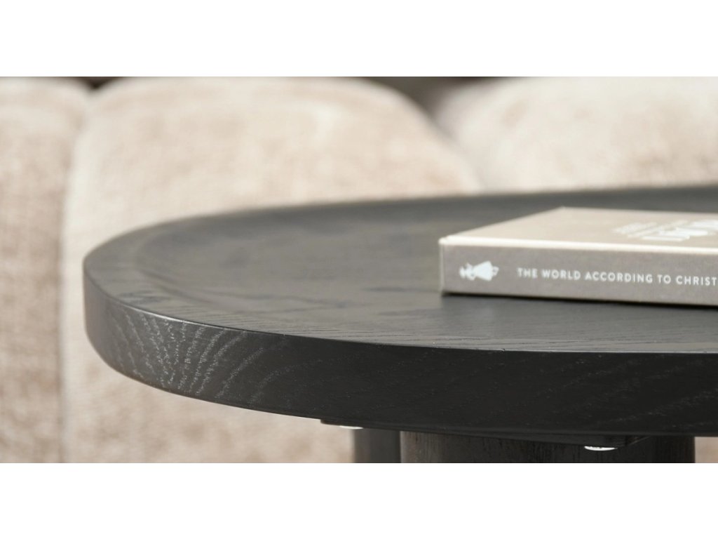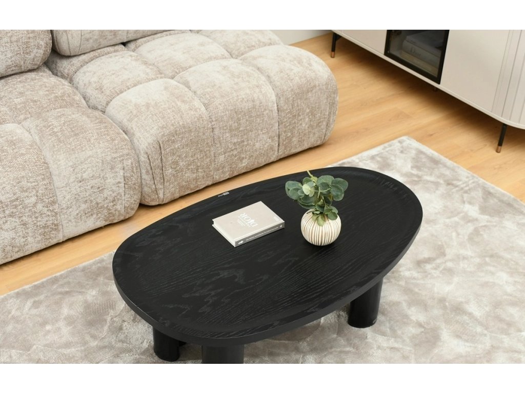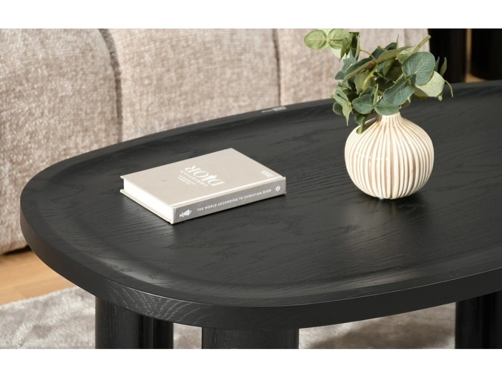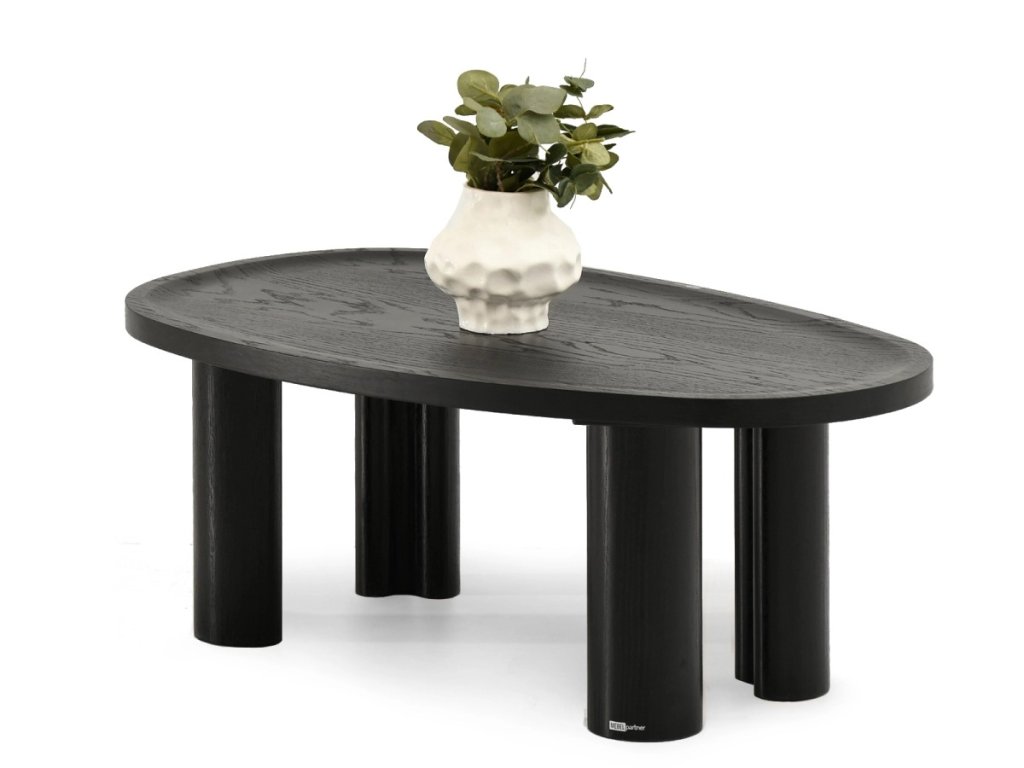 Stolová deska o tloušťce 3 cm je vyrobena z dýhované MDF desky v černém odstínu s jemným matným leskem. Nepravidelný oválný tvar s miskovým profilem a mírně vyvýšenými okraji působí esteticky a zároveň prakticky, protože zabraňuje sklouznutí drobných předmětů. Čtyři stabilní válcovité nohy z MDF s povrchovou úpravou v černé barvě ladí s deskou a dodávají stolku vyvážený vzhled i potřebnou stabilitu.