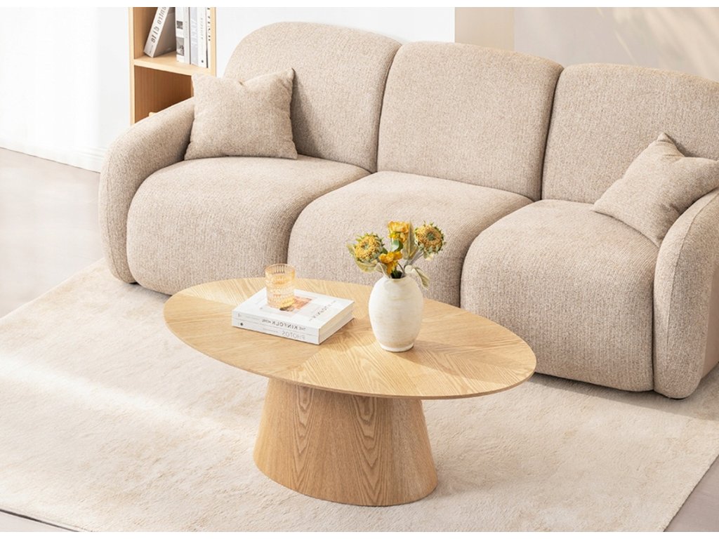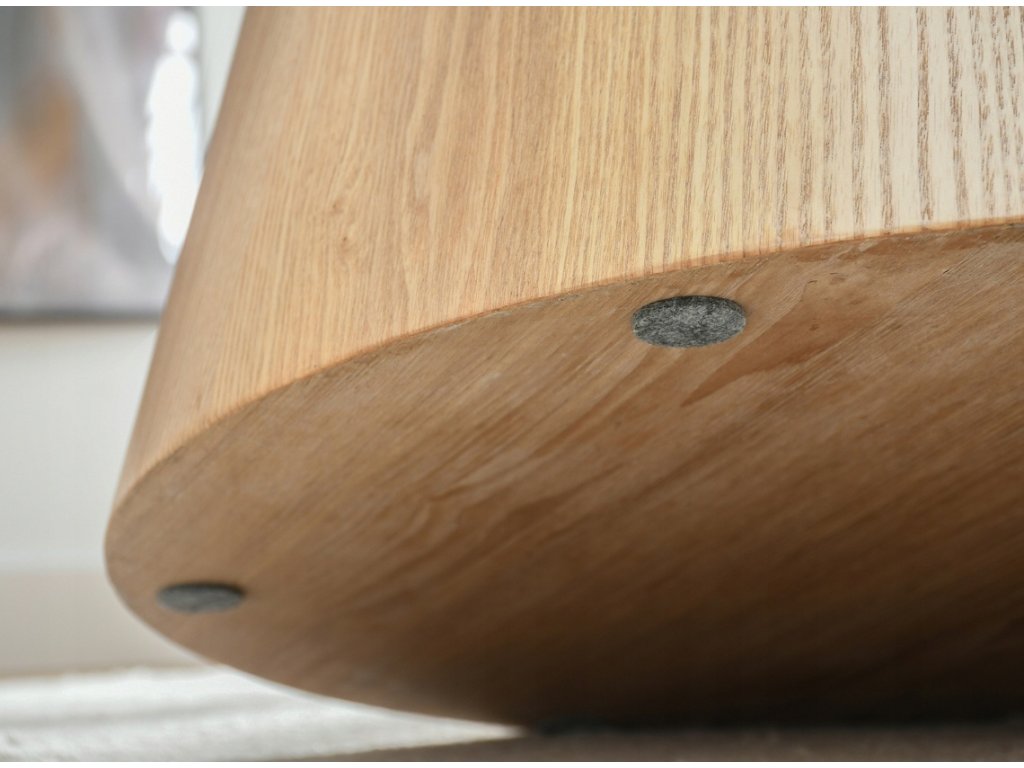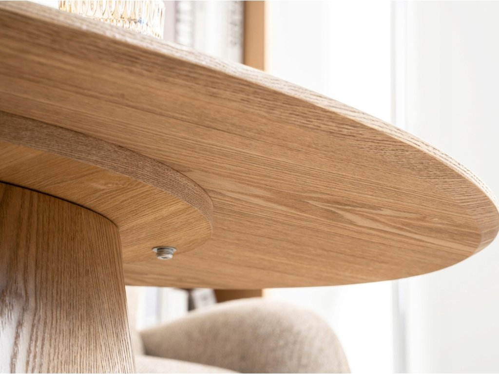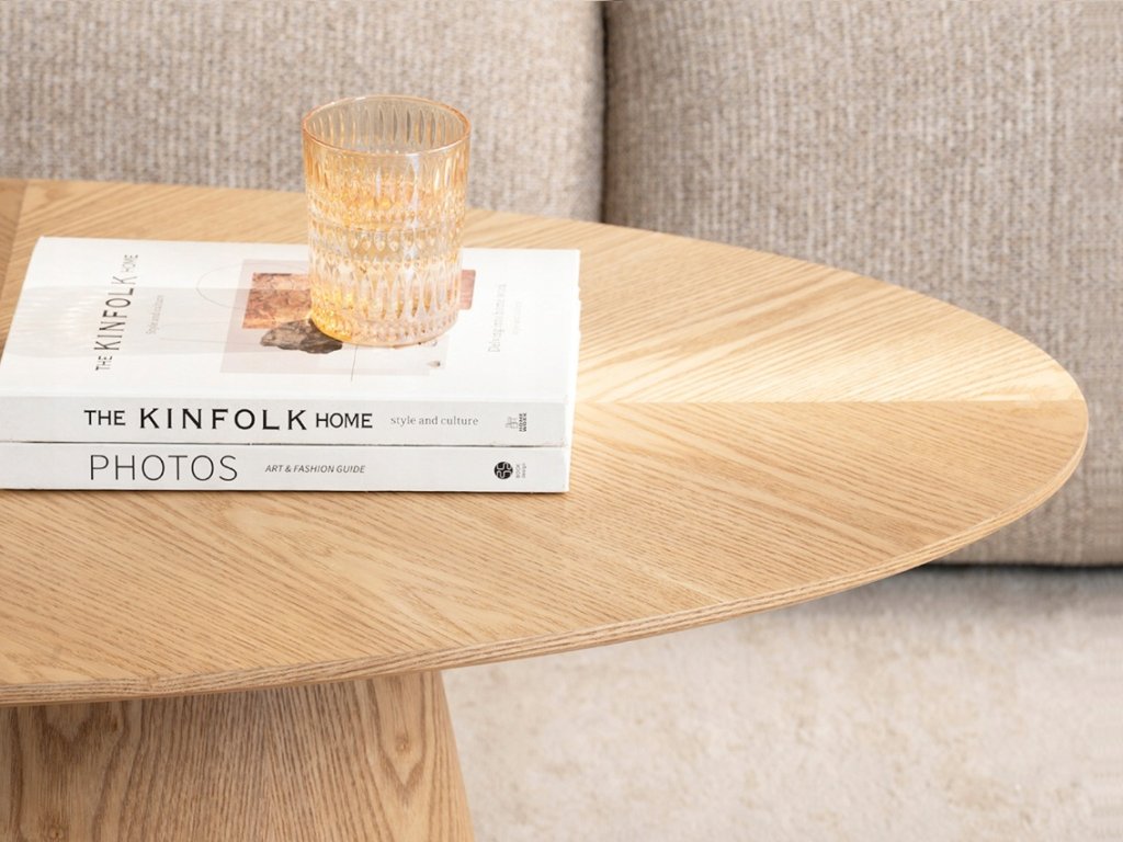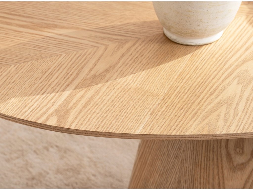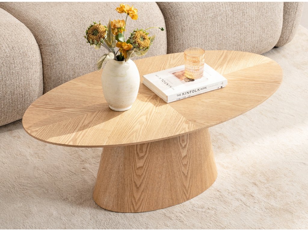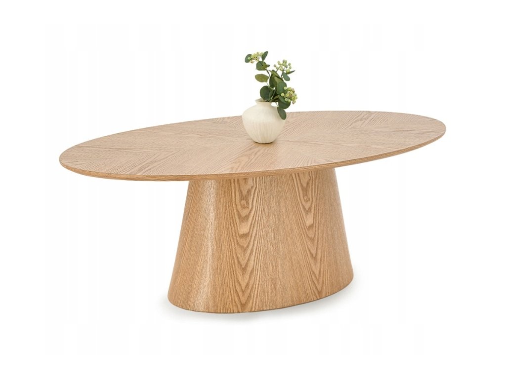Oválná deska o šířce 110 cm a přírodní dekor dubové dýhy dodávají stolku příjemný, autentický vzhled. Výrazná centrální podnož zaujme svým elegantním tvarem a jemnou kresbou dřeva, která se snadno kombinuje s moderními i skandinávskými interiéry. Stolek působí vzdušně, nadčasově a přináší do prostoru pocit tepla a klidu.