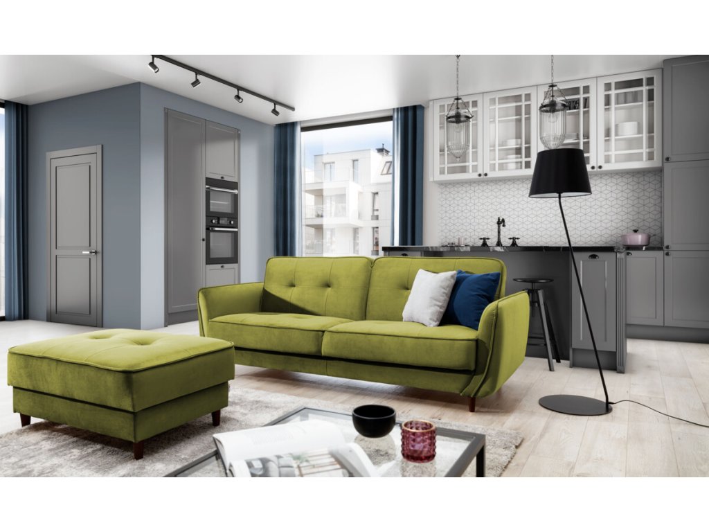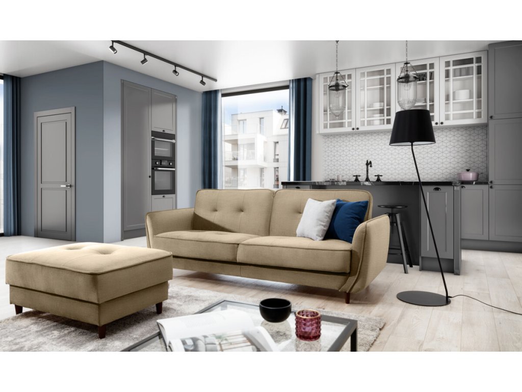 Pohovka má lehce prošitý sedák i opěrák a stojí na dřevěných nožkách. Příjemná kombinace nejen do obývacích pokojů.