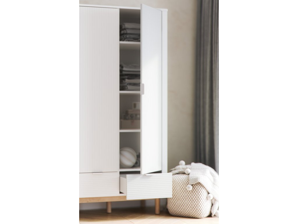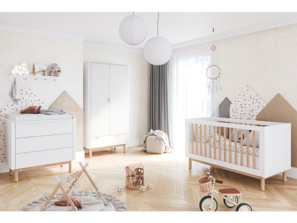 Nábytek je zhotovený v příjemném odstínu, jenž snadno sladíte s různou dekorací i hračkami. Hladký povrch je doplněný o části s decentními drážkami, celkový dojem nábytku dokreslují výraznější nožičky. Dvířka a zásuvky jsou opatřeny systémem silent - tichý dojezd, jenž nebude rušit miminka a děti při spánku a zároveň zaručuje bezpečnost při zavírání. Nábytek je k zakoupení jednotlivě či ve zvýhodněných setech.