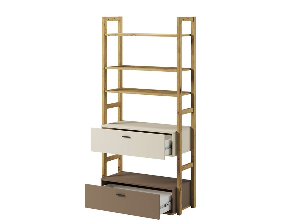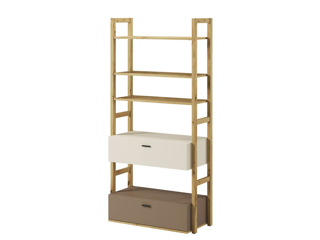 Regál z kolekce Lenny je rozdělený na police v různé výšce a dvě zásuvky. Díky takovému rozmístění polic se skvěle hodí k odkládání knih, dekorace, pokojových květin a osvětlení. Velmi praktické jsou dvě prostorné zásuvky v lanýžové a béžové barvě, které doplňují dekor dřeva rámu a polic. Kombinace dřeva a barev je moderní a nadčasové spojení.