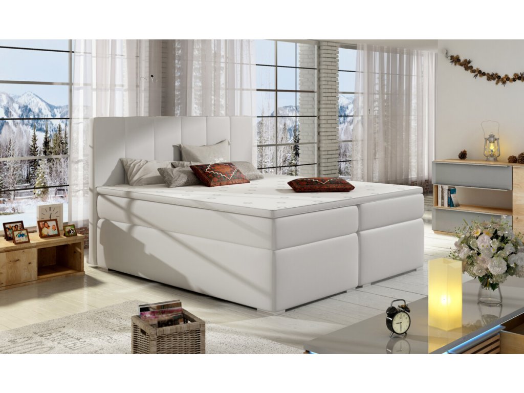 Pohodlná kontinentální postel se stylovým čelem je vhodná pro všechny náročné spáče. Komfort spánku a odpočinku zajistí pružinová matrace (20 cm) a topper (4 cm).