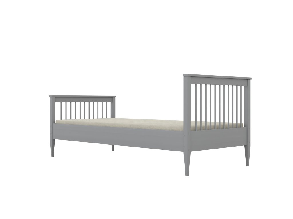 Rám postele tvoří pevný borovicový masiv ošetřený kvalitním lakem v šedém odstínu, který chrání dřevo a zachovává jeho přirozenou strukturu.