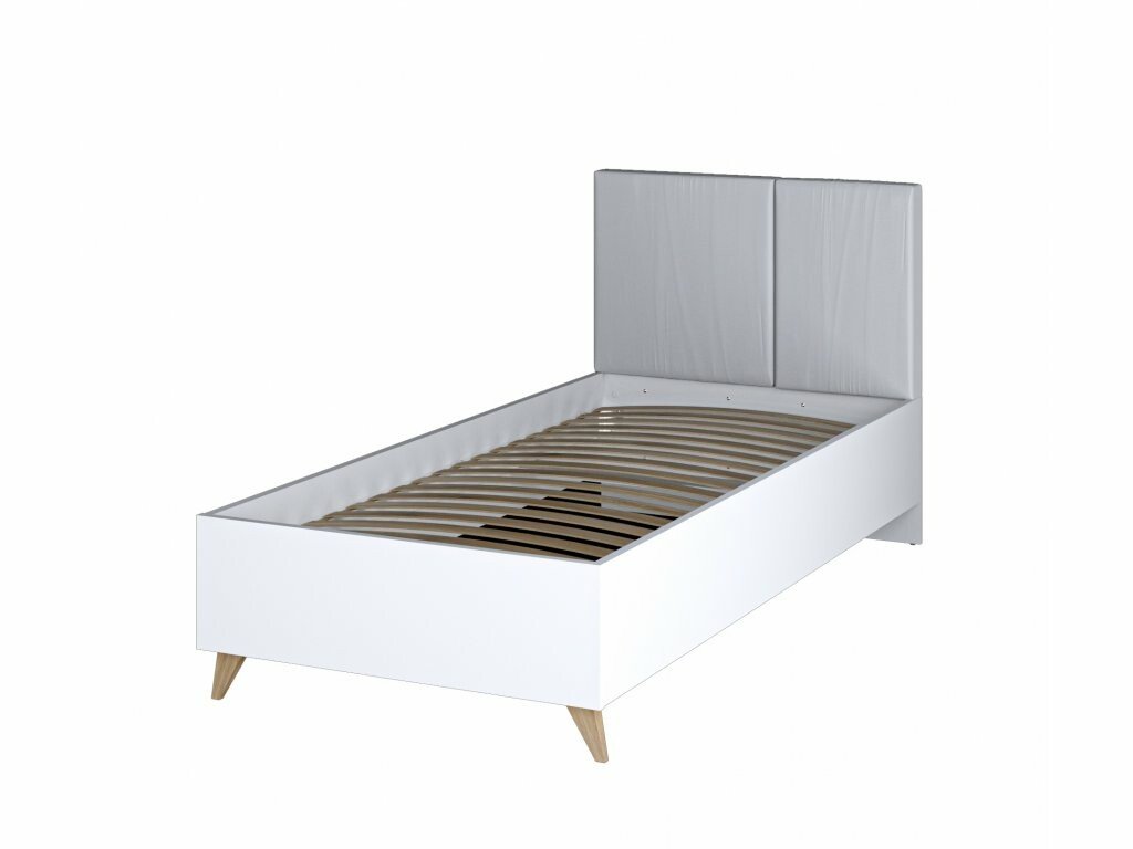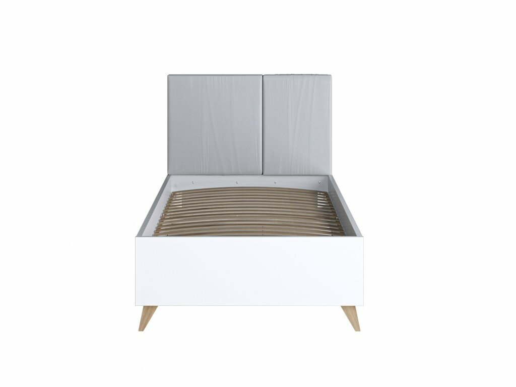 Na posteli Mood je hned několik prvků, jež stojí za povšimnutí. Jedním z nich je čalouněné čelo ve světle šedém odstínů, jež ocení především děti a studenti, kteří si před spaním s oblibou přečtou pár řádků. Dalším funkční detailem jsou šikmé, štíhlé nohy v medovém odstínu dubu Castello, díky kterým postel neleží na zemi, což odlehčí celkový vzhled.