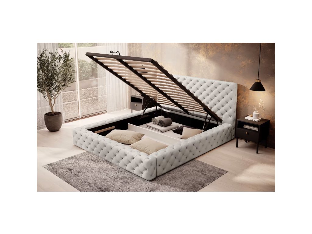 Součástí postele jsou dřevěné lamelové rošty v kovovém rámu, které lze snadnou manipulací vyklopit a využít tak prostor pod nimi k uskladnění lůžkovin, sezónního oblečení a dalších věcí.