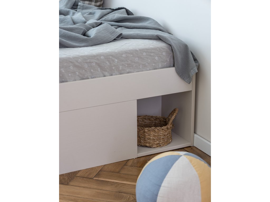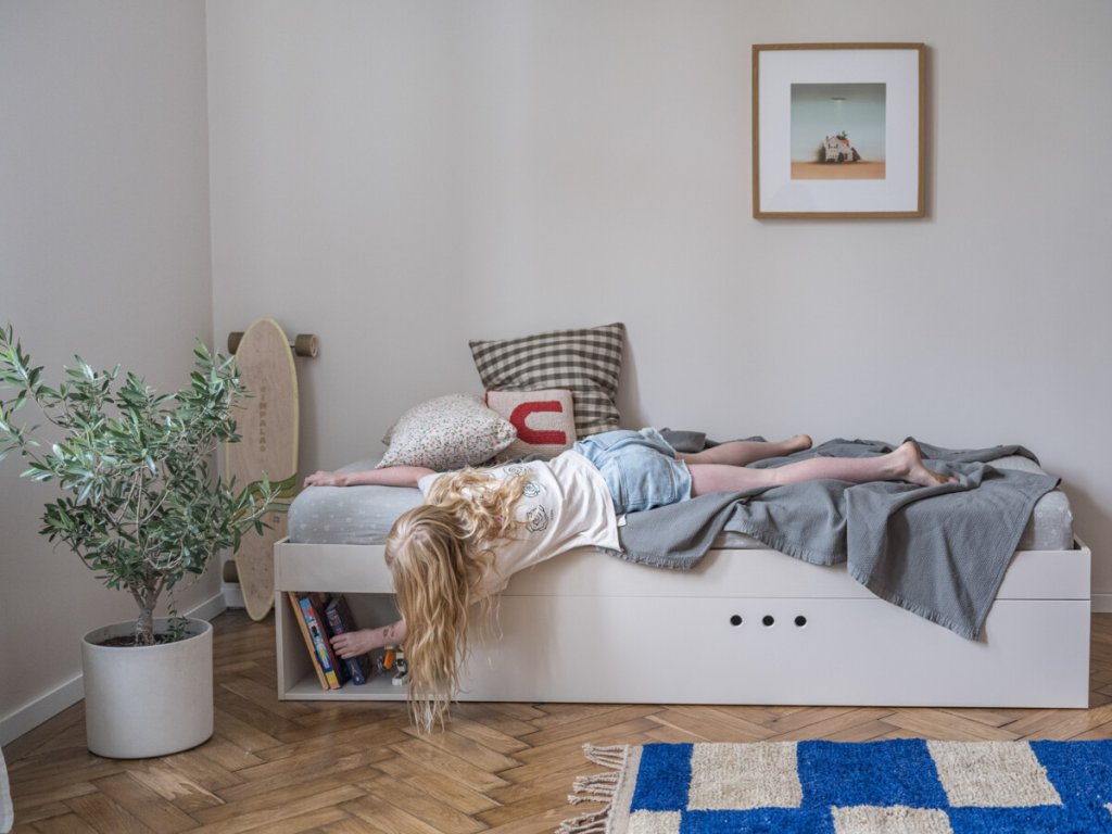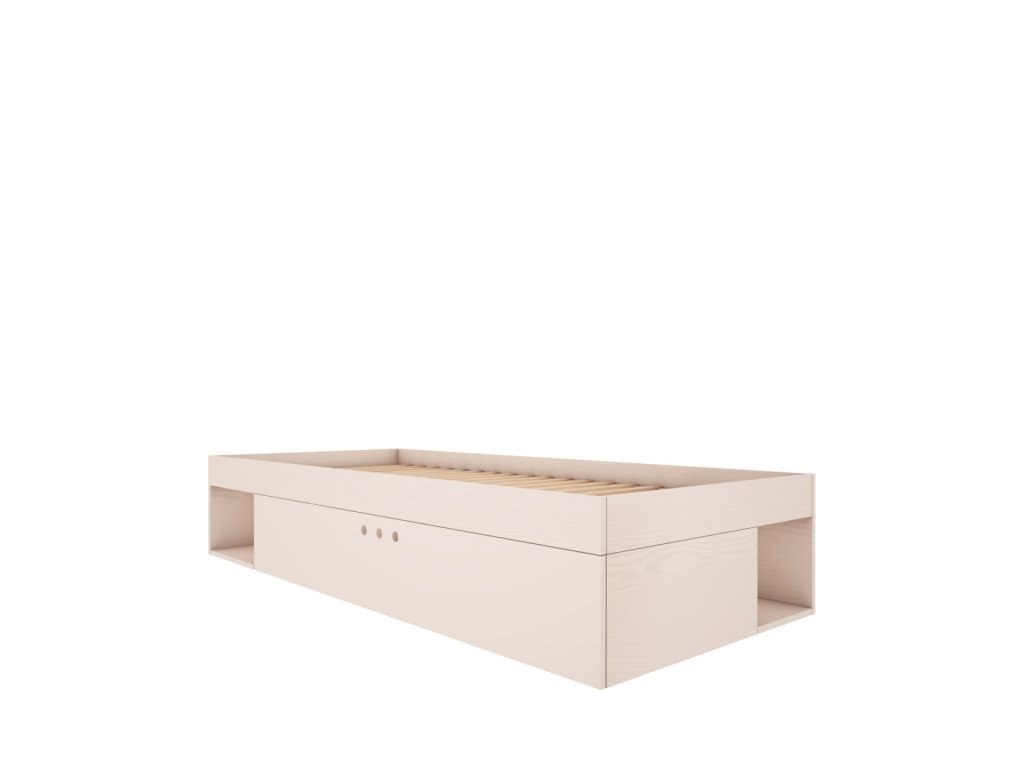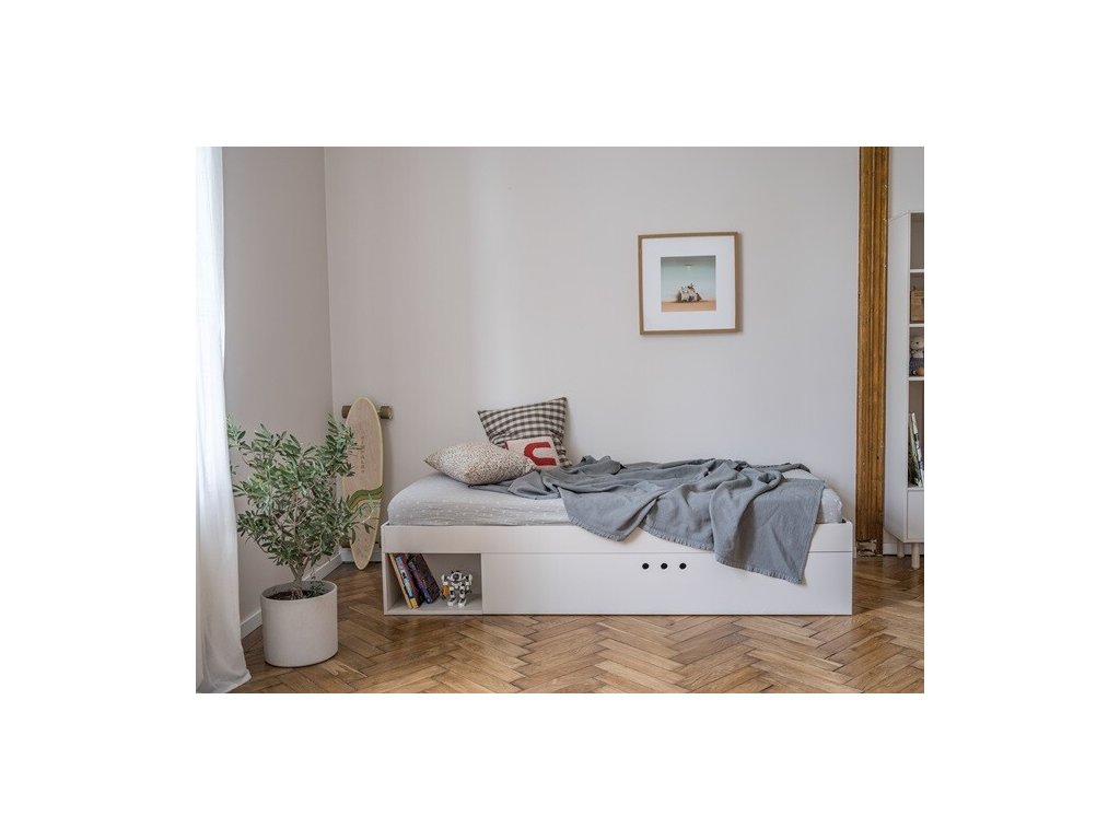 Postel River disponuje úložným prostorem v zásuvce a otevřených policích. Postel se hodí do různě laděných interiérů, ať už do pokojů dětí či dospělých.