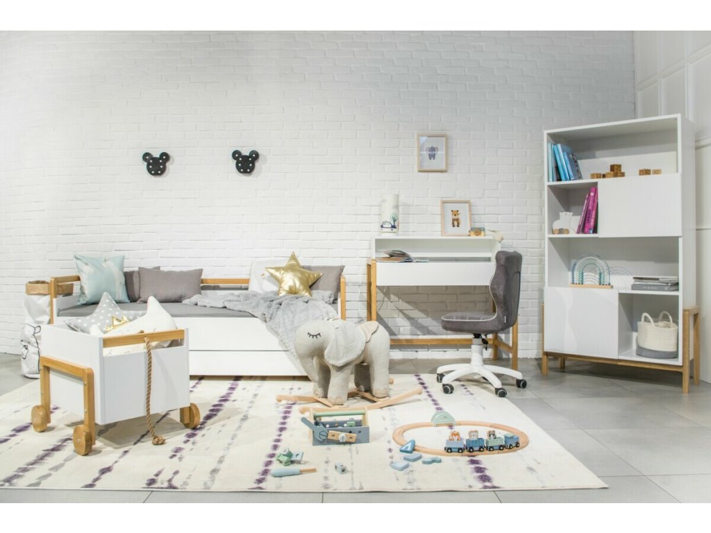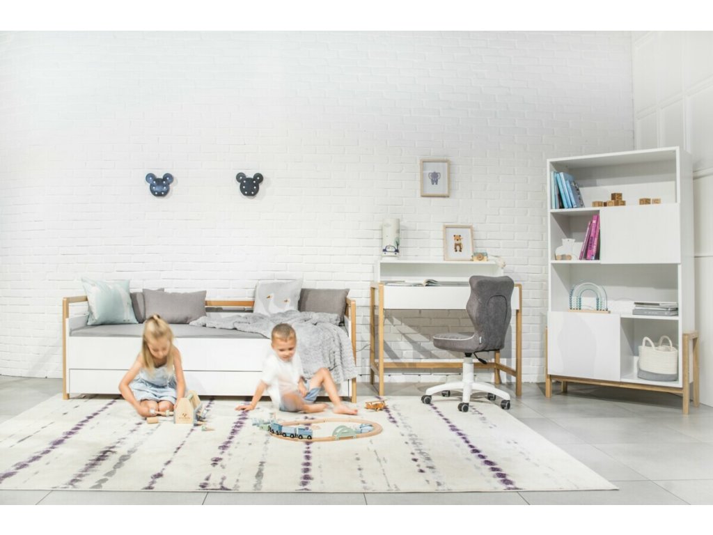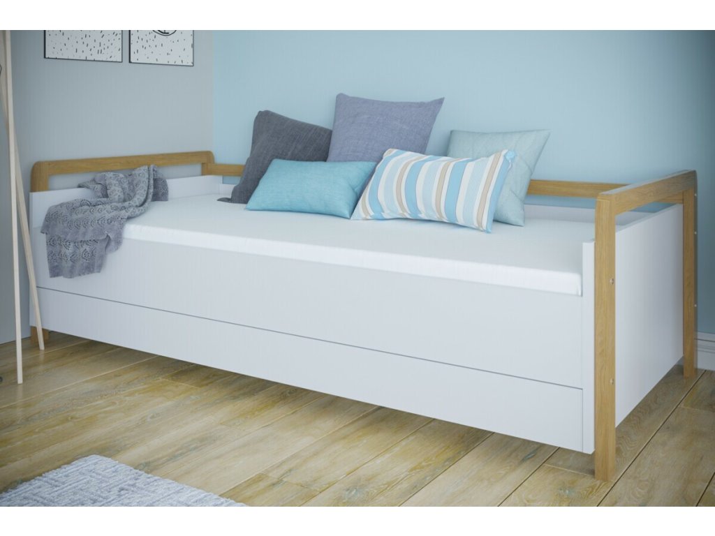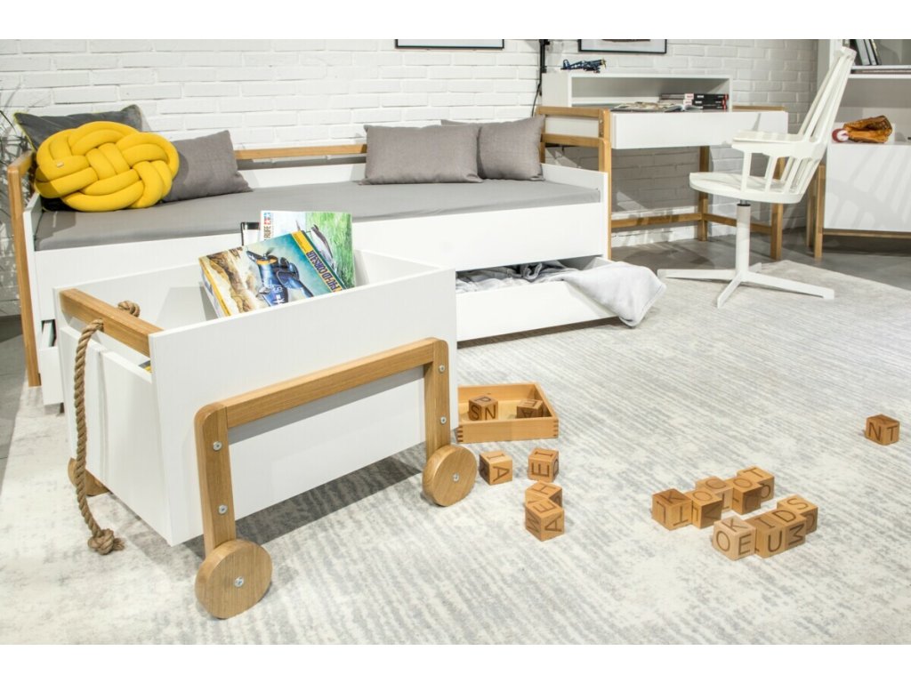Perfektně vymyšlená postel nejen do dětských pokojů má hned několik možností využití. Večer slouží jako kvalitní místo pro spánek a přes den jako menší pohovka na sezení a hraní. Postel je ze tří stran opatřená rámem z dubového dřeva, jež tvoří estetickou a zároveň bezpečnostní funkci. Skvělým doplňkem postele je prostorná zásuvka, do které lze umístit lůžkoviny a třeba hračky.