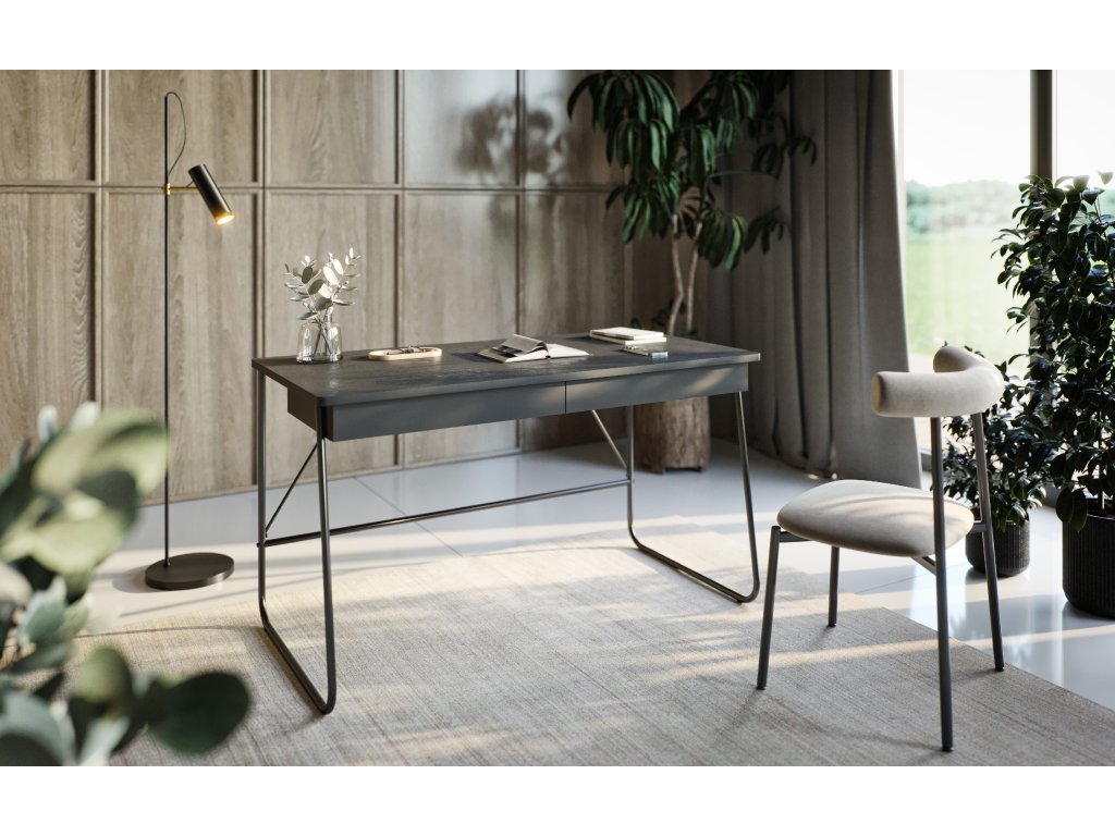 Pracovní stůl poskytuje dostatek místa pro notebook, monitor, dokumenty i doplňky, aniž by stůl působil robustně.
