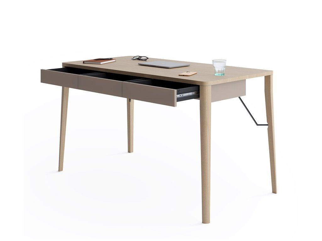 Stůl je vybaven třemi výsuvnými zásuvkami umístěnými pod deskou, které nabízejí praktický úložný prostor pro kancelářské potřeby, dokumenty nebo drobnosti. Zásuvky jsou rozděleny rovnoměrně po celé šířce stolu a zachovávají čistý vzhled nábytku.