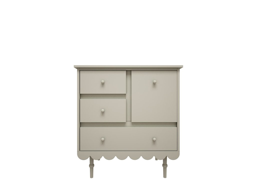 Komoda Babuška vyniká pečlivým zpracováním a elegantními detaily, jako jsou vyšší nožičky z bukového dřeva a jemně tvarované zakončení spodní hrany. Díky tomu působí lehce a vzdušně, a zároveň zůstává stabilní a pevná.