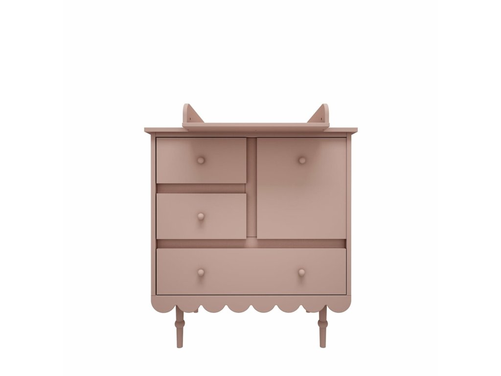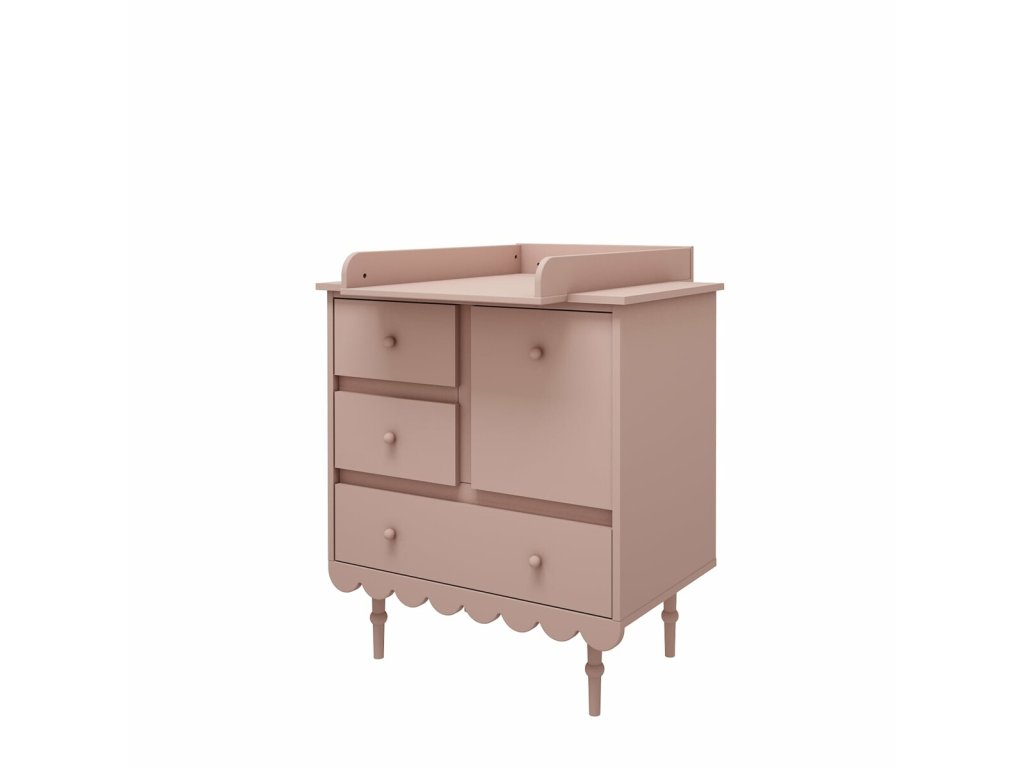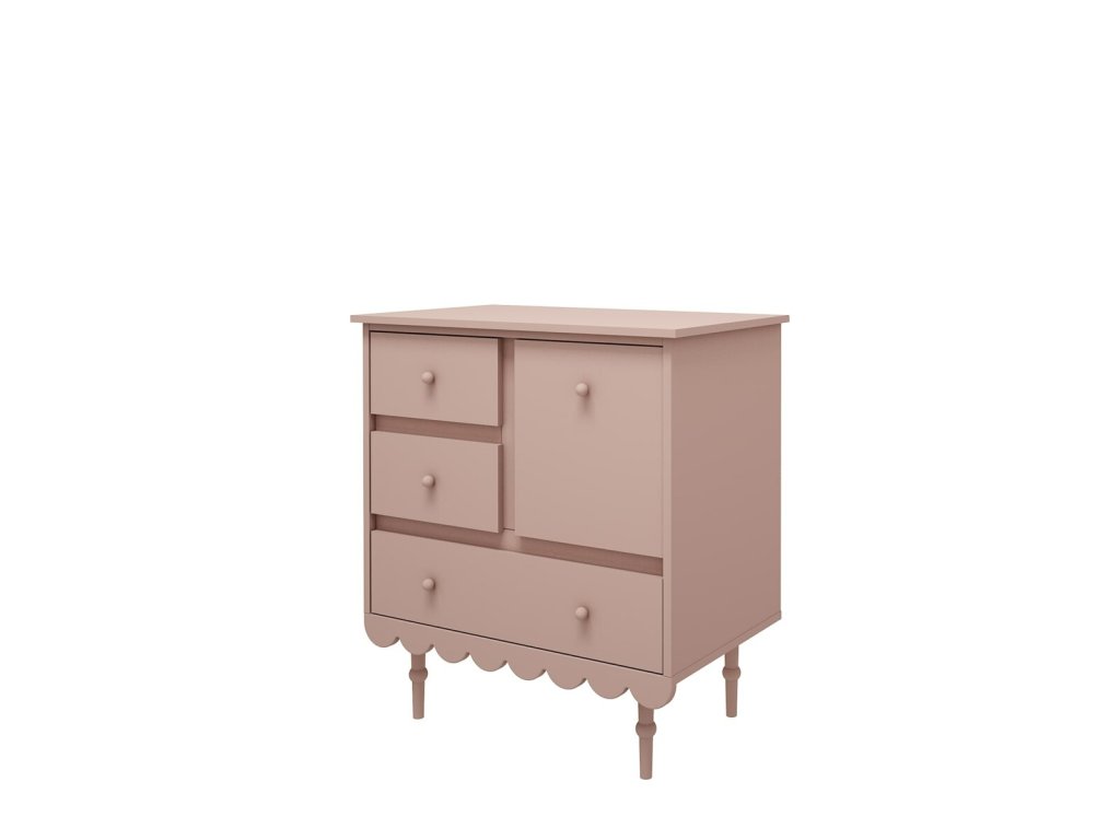 Nábytek je proveden v jemném odstínu s prvky dřeva, jenž snadno sladíte s různými dekoracemi i hračkami. Výraznými prvky kolekce jsou vyšší nožičky s dekorací, obloukové zakončení připomínající krajku, lehce přesahující vrchní desky a další jedinečné detaily.