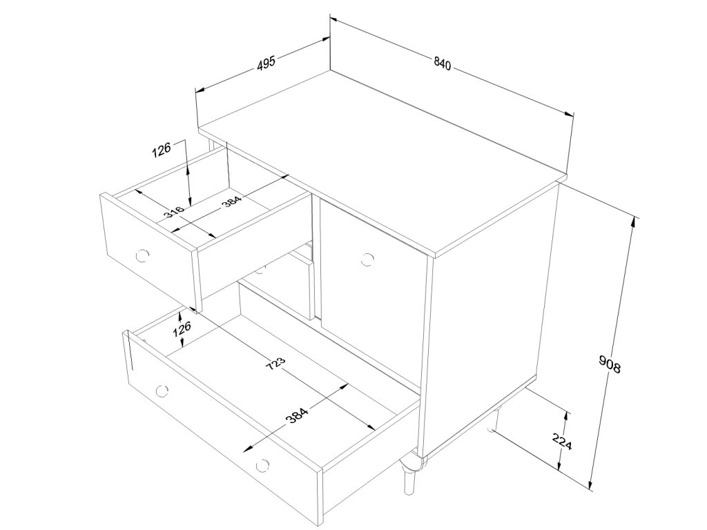 - lakovaná MDF deska (přední strana, vrchní deska), laminovaná deska (korpus, zásuvka), bukové dřevo (nohy), hrany zakončené lištou ABS