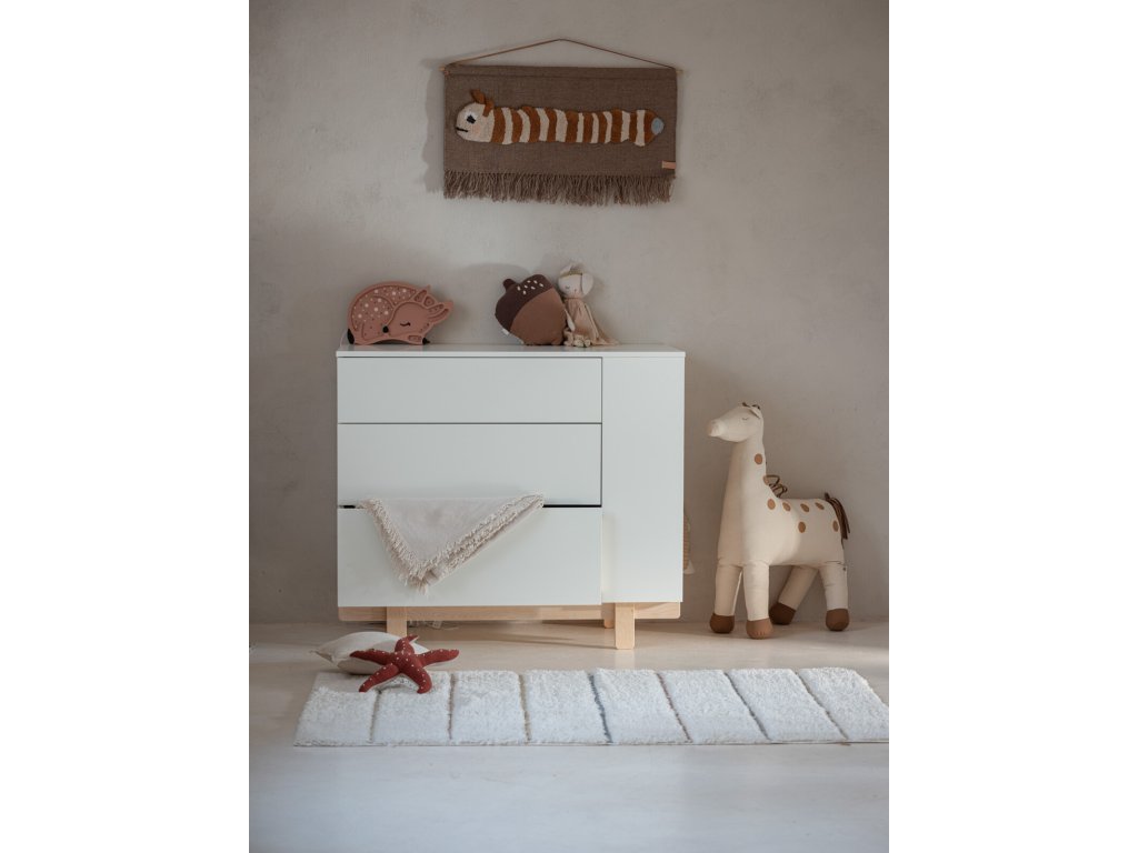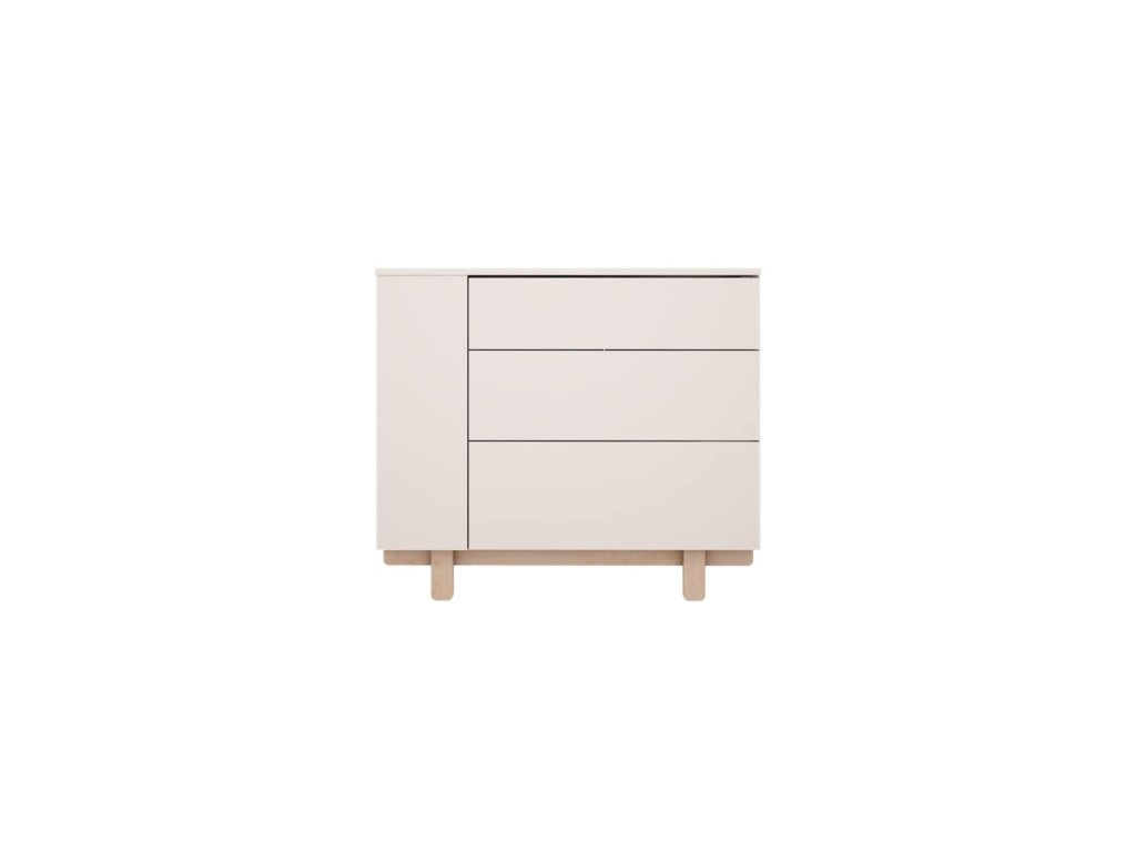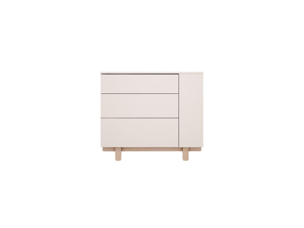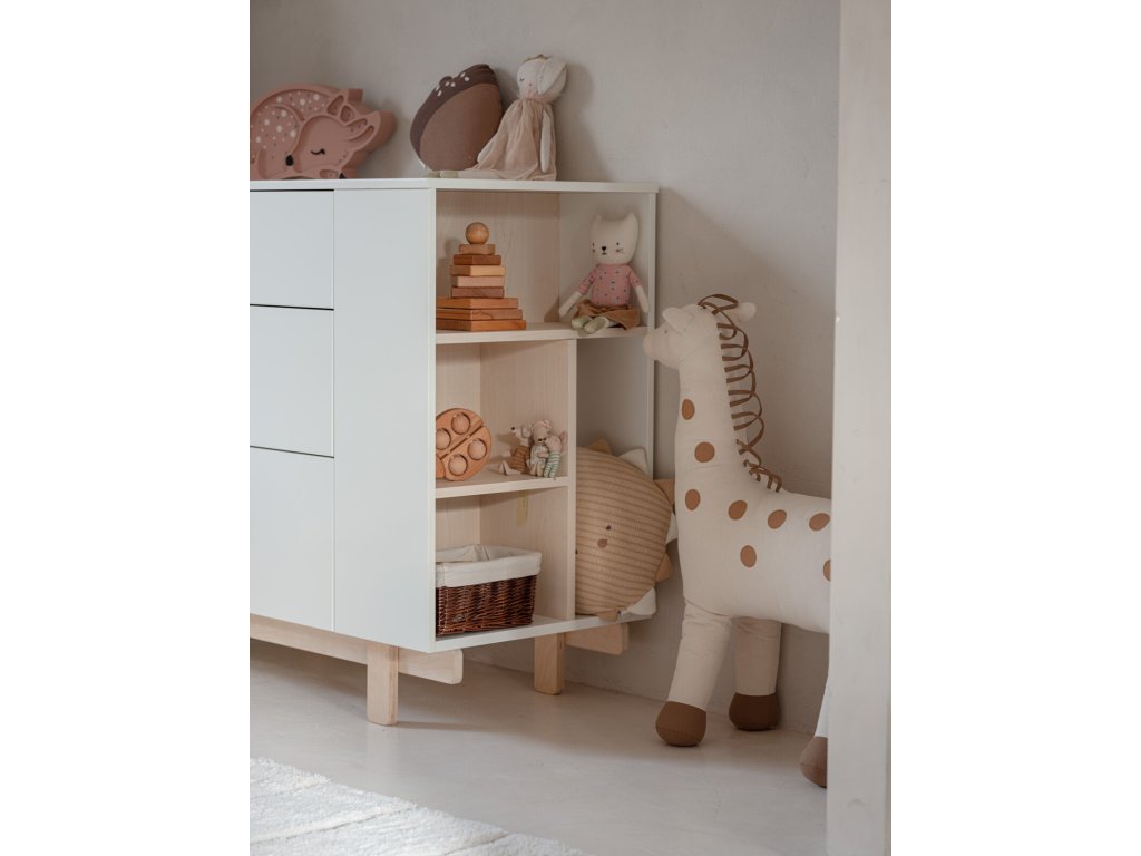 Nábytek je proveden v jemném odstínu s prvky dřeva, jenž snadno sladíte s různými dekoracemi i hračkami. Hladký povrch bez rušivých úchytů poskytuje elegantní vzhled, zatímco otevírání je zajištěno systémem push-to-open – stačí lehce zatlačit, a dvířka nebo zásuvky se samy otevřou.