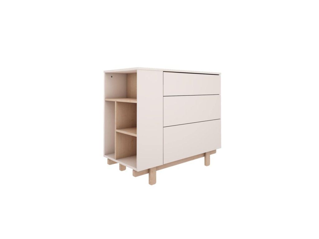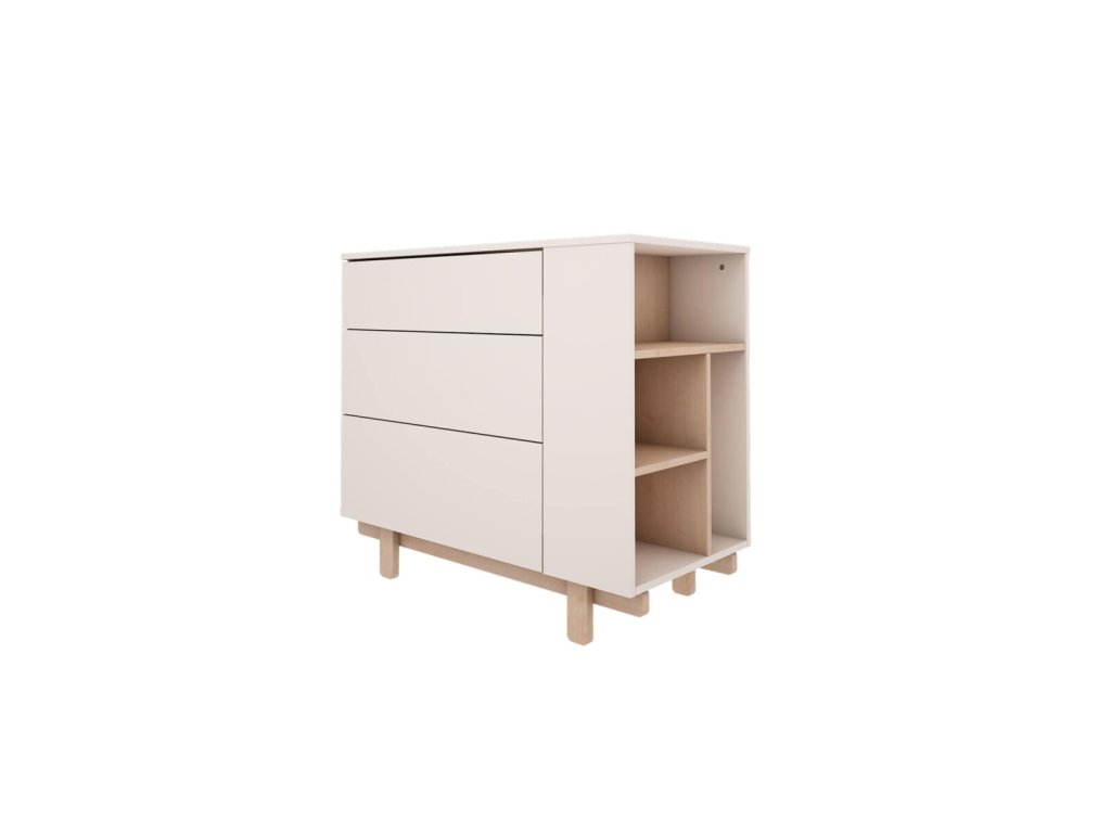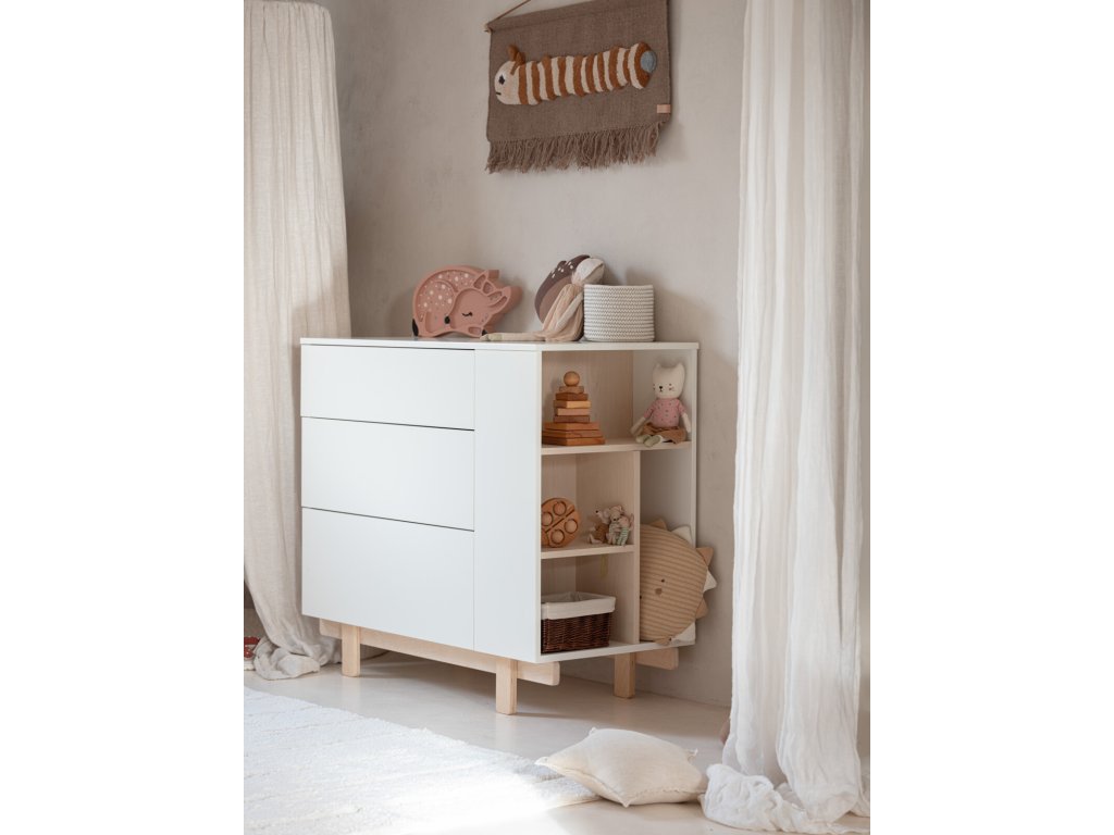 Elegantní komoda Basic je rozdělená na tři zásuvky a otevřené police na boční straně. Komoda je skvělým pomocníkem při organizaci oblečení, hraček a dalších věcí, ať už v pokoji pro miminka, starší děti, studenty i dospělé. Otevřené police poslouží jako menší knihovna či prostor pro bytovou dekoraci a oblíbené hračky.