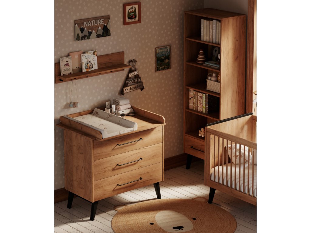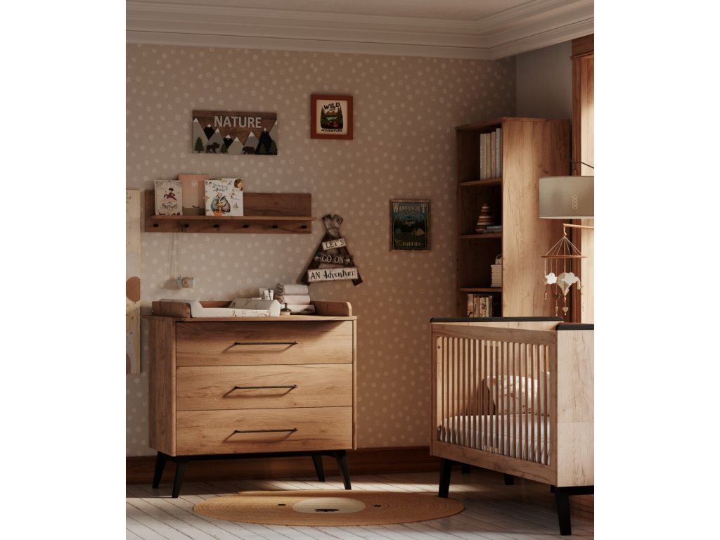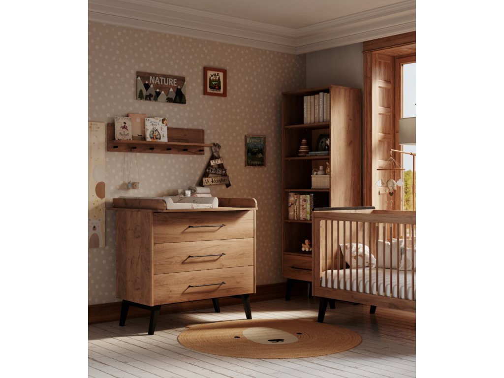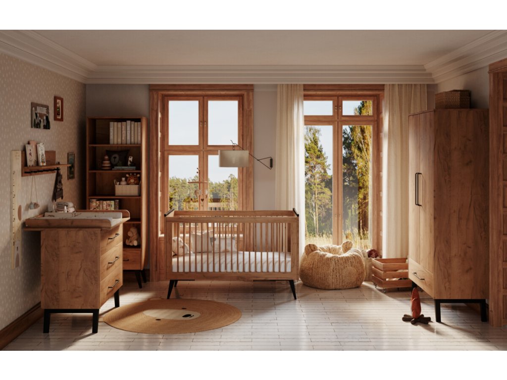 Nábytek je zhotovený v příjemném odstínu dřeva, jenž snadno sladíte s různou dekorací i hračkami. Hladký povrch je doplněný o kovové úchyty a celkový dojem nábytku dokreslují výraznější nožičky. Dvířka a zásuvky jsou opatřeny systémem silent - tichý dojezd, jenž nebude rušit miminka a děti při spánku a zároveň zaručuje bezpečnost při zavírání. Nábytek je k zakoupení jednotlivě či ve zvýhodněných setech.