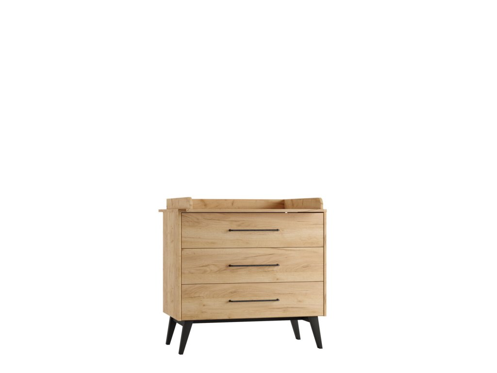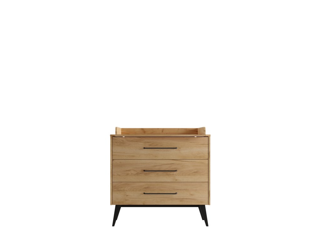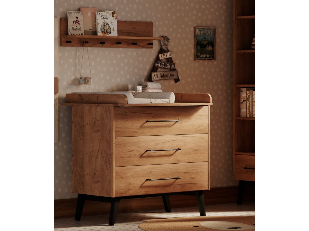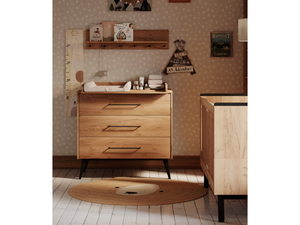 Nábytek je zhotovený v příjemném odstínu dřeva, jenž snadno sladíte s různou dekorací i hračkami. Hladký povrch je doplněný o kovové úchyty a celkový dojem nábytku dokreslují výraznější nožičky. Dvířka a zásuvky jsou opatřeny systémem silent - tichý dojezd, jenž nebude rušit miminka a děti při spánku a zároveň zaručuje bezpečnost při zavírání. Nábytek je k zakoupení jednotlivě či ve zvýhodněných setech.