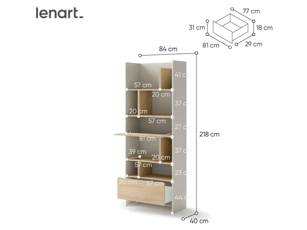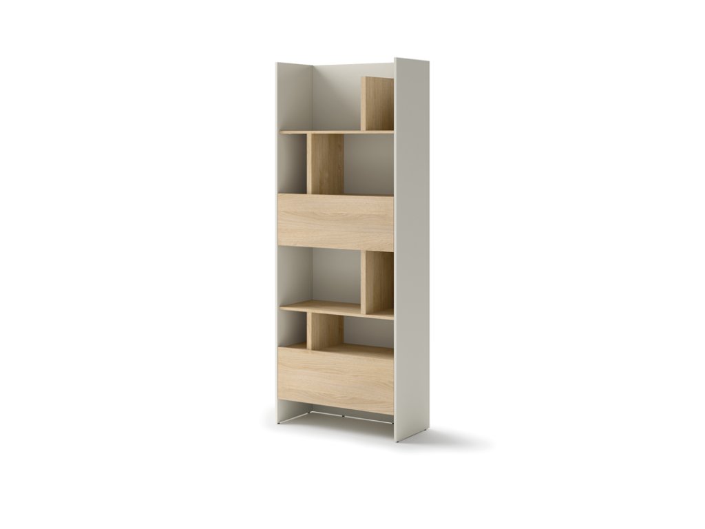 Elegantní designový regál, který kombinuje dva příjemné odstíny, skvěle zapadne do kolekce nábytku Bed Concept. Poskytuje praktický úložný prostor pro knihy, dekorace, rostliny nebo oblíbené doplňky. Díky promyšlenému uspořádání polic nabízí nejen funkčnost, ale i estetický prvek v podobě police s výklopnými dvířky.