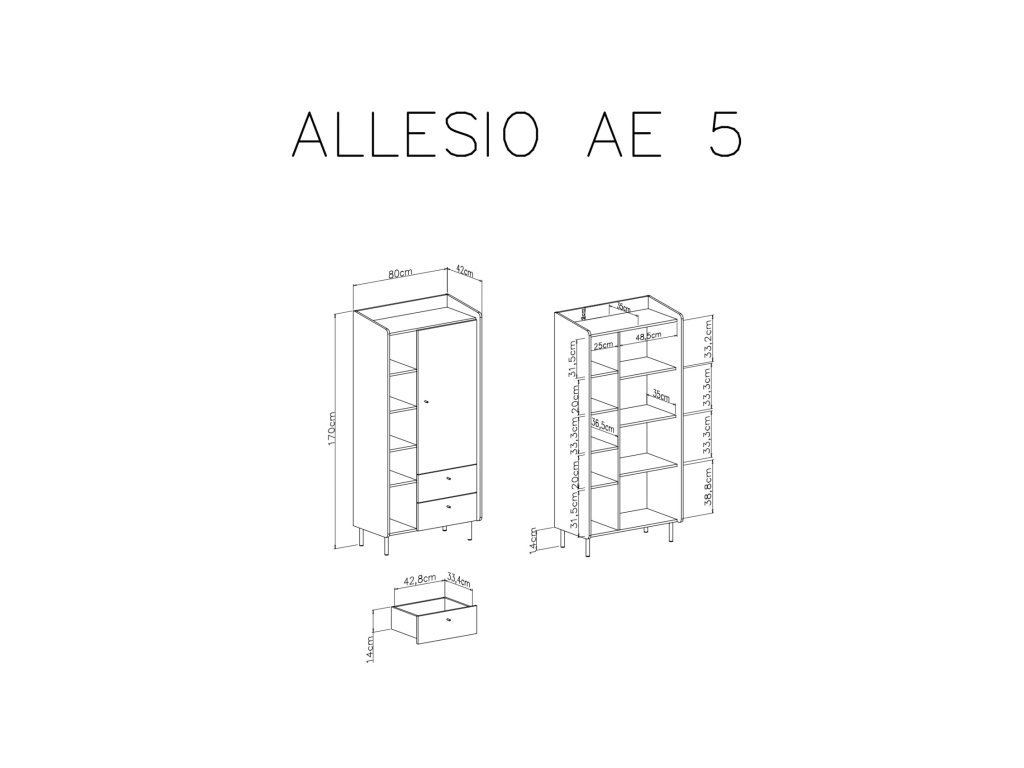 Moderní kolekce nábytku Alessio je zhotovená v odstínu eukalyptové barvy v kombinaci s dubem baltic dune. Designový nábytek splňuje funkční potřeby, ale také slouží jako výrazný prvek interiéru. Nevšedním detailem této kolekce jsou přesahující a vyvýšené okraje, které zabraňují pádu předmětů na zem. Dvířka a zásuvky se otevírají pomocí drobných úchytů. Nábytek stojí na vyšších nožičkách, jež odlehčují celkový vzhled nábytku.