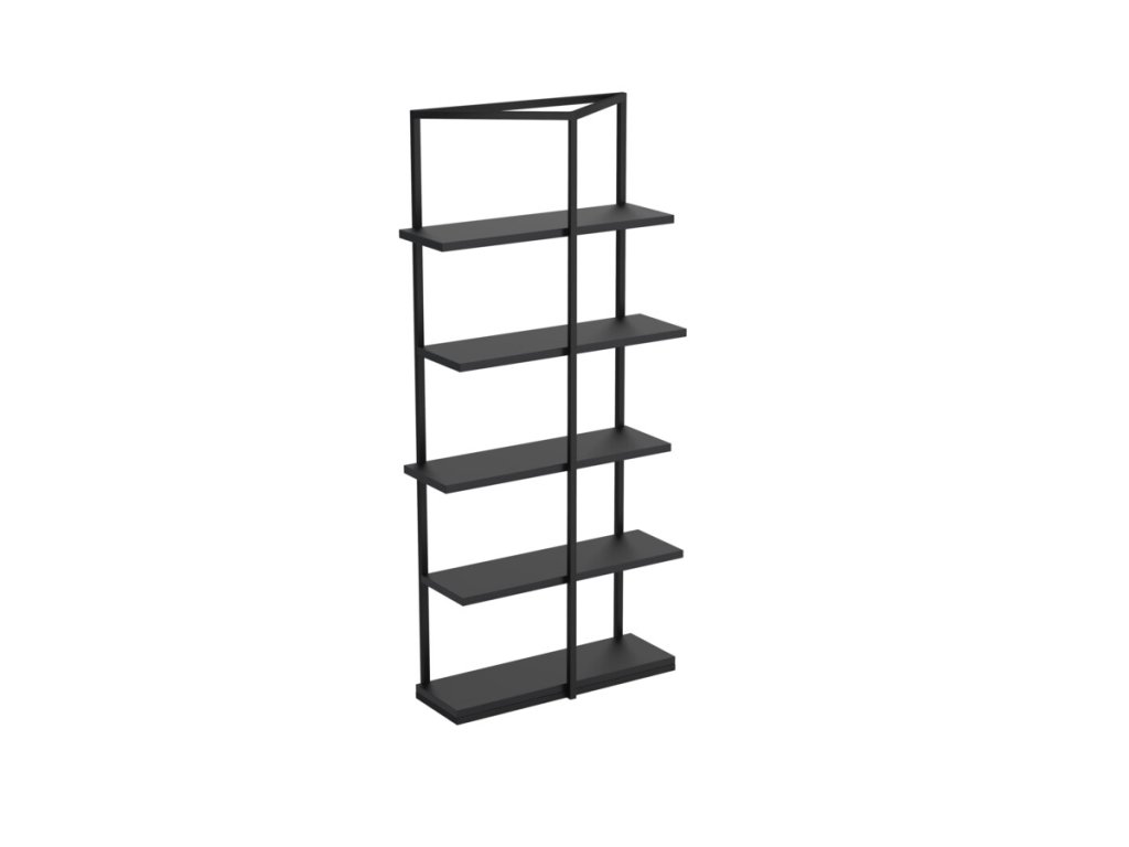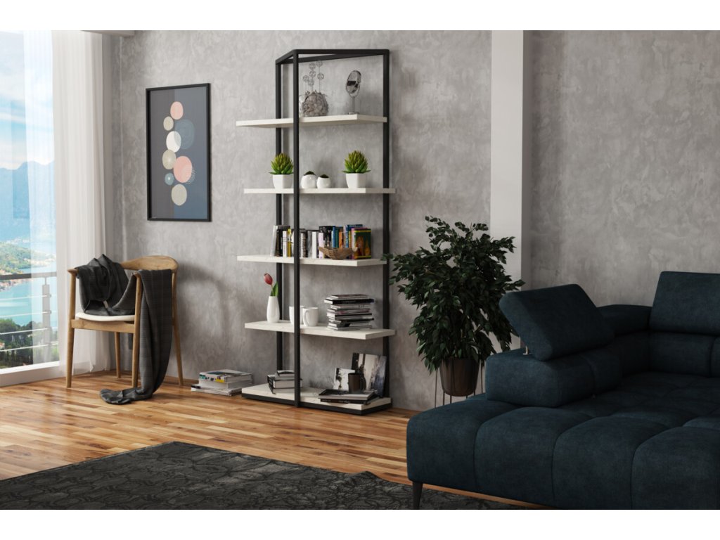 Stylový regál s policemi doplní úložné prostory v obývacím pokoji a zároveň tvoří perfektní místo k umístění bytové dekorace, pokojových květin a knih. Desky polic lehce vyčnívají po stranách a drží pomocí kovové konstrukce. Strany nejsou uzavřené, regál tak působí vzdušně.