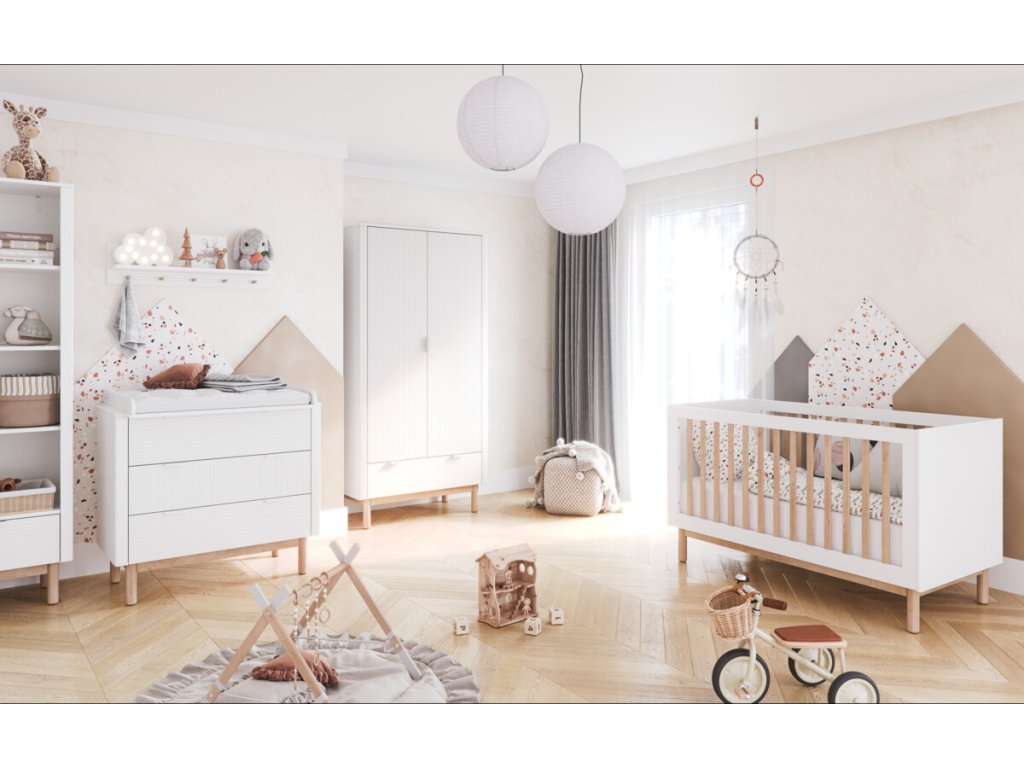 Nábytek je zhotovený v příjemném odstínu, jenž snadno sladíte s různou dekorací i hračkami. Hladký povrch je doplněný o části s decentními drážkami, celkový dojem nábytku dokreslují výraznější nožičky. Dvířka a zásuvky jsou opatřeny systémem silent - tichý dojezd, jenž nebude rušit miminka a děti při spánku a zároveň zaručuje bezpečnost při zavírání. Nábytek je k zakoupení jednotlivě či ve zvýhodněných setech.