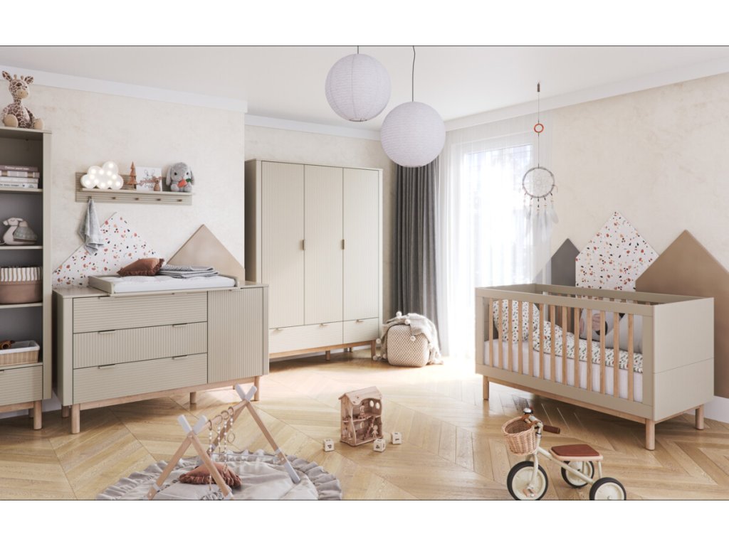 Nábytek je zhotovený v příjemném odstínu, jenž snadno sladíte s různou dekorací i hračkami. Hladký povrch je doplněný o části s decentními drážkami, celkový dojem nábytku dokreslují výraznější nožičky. Dvířka a zásuvky jsou opatřeny systémem silent - tichý dojezd, jenž nebude rušit miminka a děti při spánku a zároveň zaručuje bezpečnost při zavírání. Nábytek je k zakoupení jednotlivě či ve zvýhodněných setech.