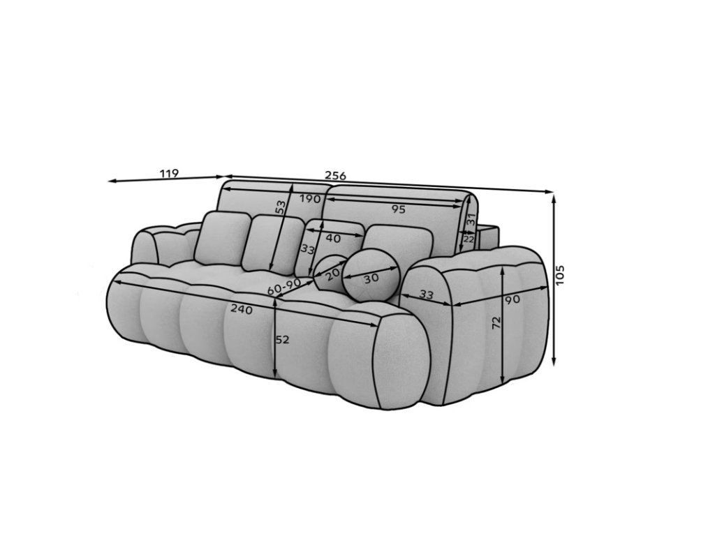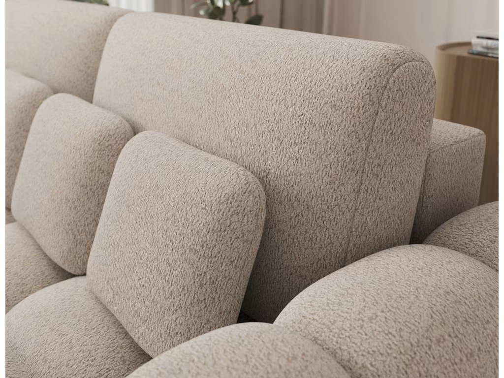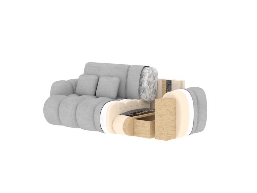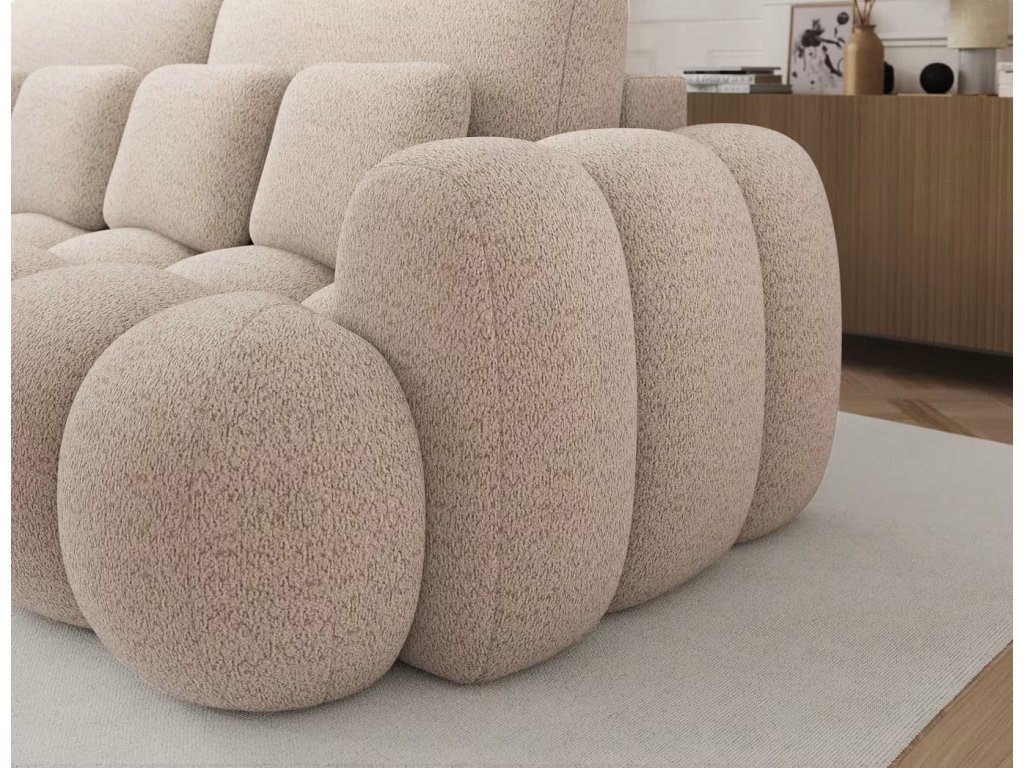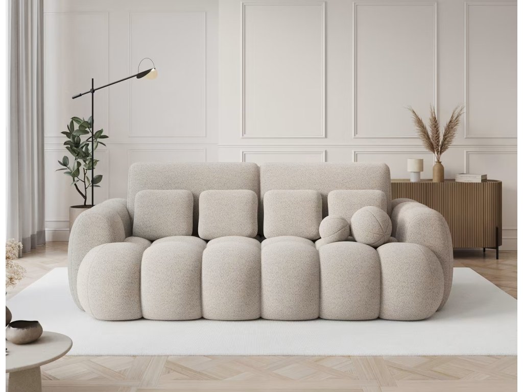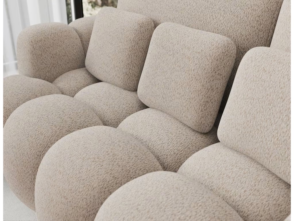 Pohovka Coton vyniká originálním vzhledem tvořeným výraznými čalouněnými bloky, které působí dojmem nadýchaných polštářů. Měkké oblé linie dodávají celému modelu jemnost a hravost, zatímco hladké zadní čelo vytváří elegantní kontrast. Součástí jsou volně ložené opěrné polštáře a dva malé kulaté polštářky, které doplňují pohodlí i estetiku tohoto výrazného kusu nábytku.