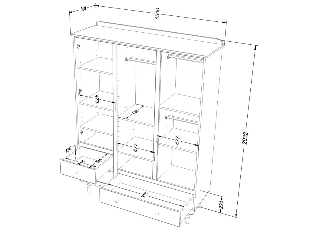 Šatní skříň Babushka je rozdělená na prostorné police a šatní tyče k zavěšení oděvů. Ve spodní části jsou umístěny zásuvky na drobnější textil a hračky. Prakticky navržený úložný prostor napomáhá k organizaci oblečení, hraček a dalších věcí.
