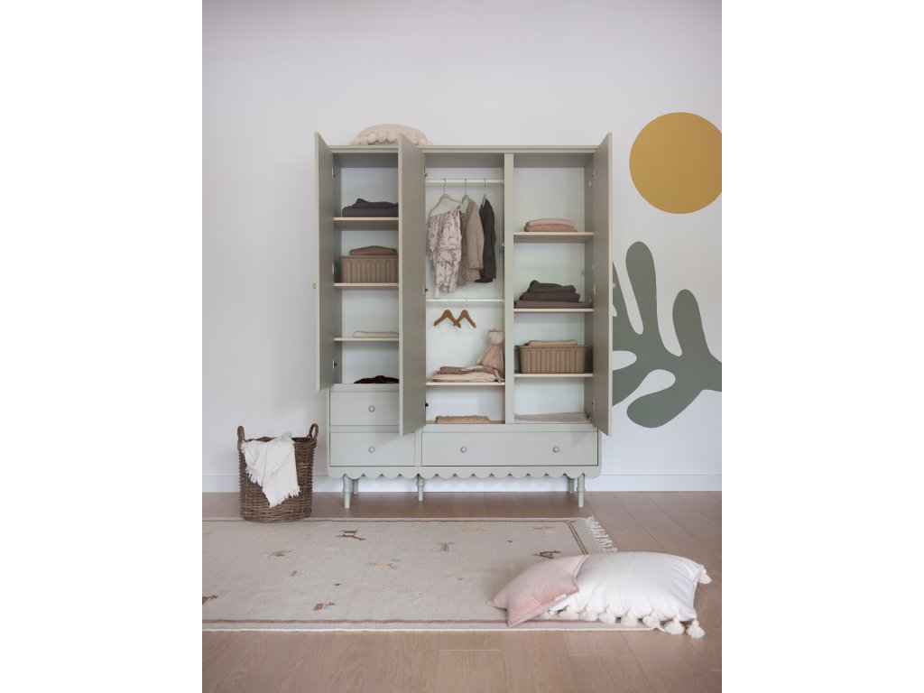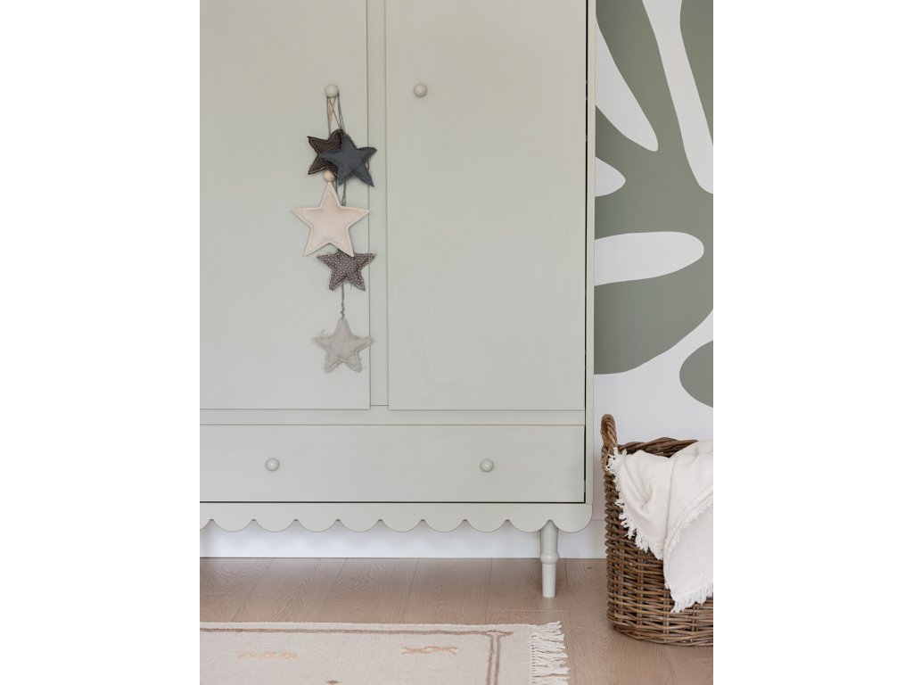 Skříň z kolekce Babushka se pyšní originálními prvky v podobě vyšších nožiček s ozdobným detailem a obloukovým zakončením připomínající krajku. Velmi elegantní a kvalitní kousek, který by neměl chybět v dětském pokoji.