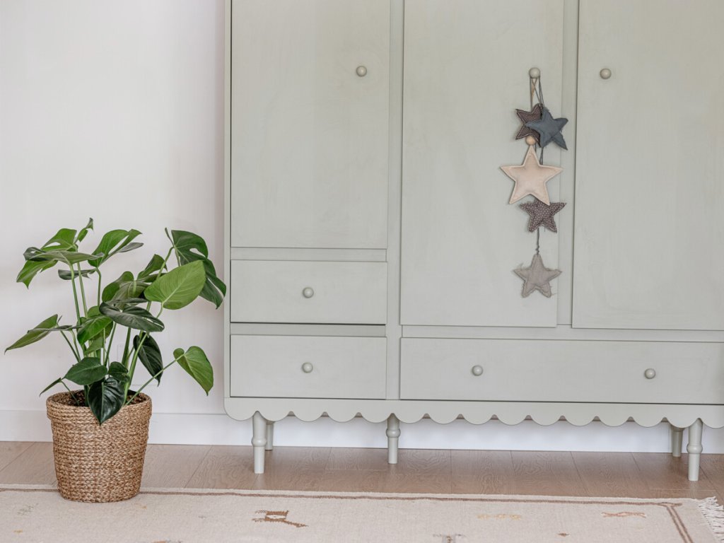 Šatní skříň Babushka je rozdělená na prostorné police a šatní tyče k zavěšení oděvů. Ve spodní části jsou umístěny zásuvky na drobnější textil a hračky. Prakticky navržený úložný prostor napomáhá k organizaci oblečení, hraček a dalších věcí.