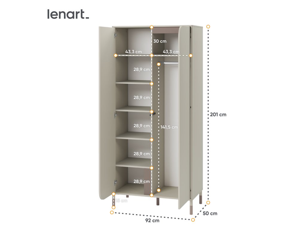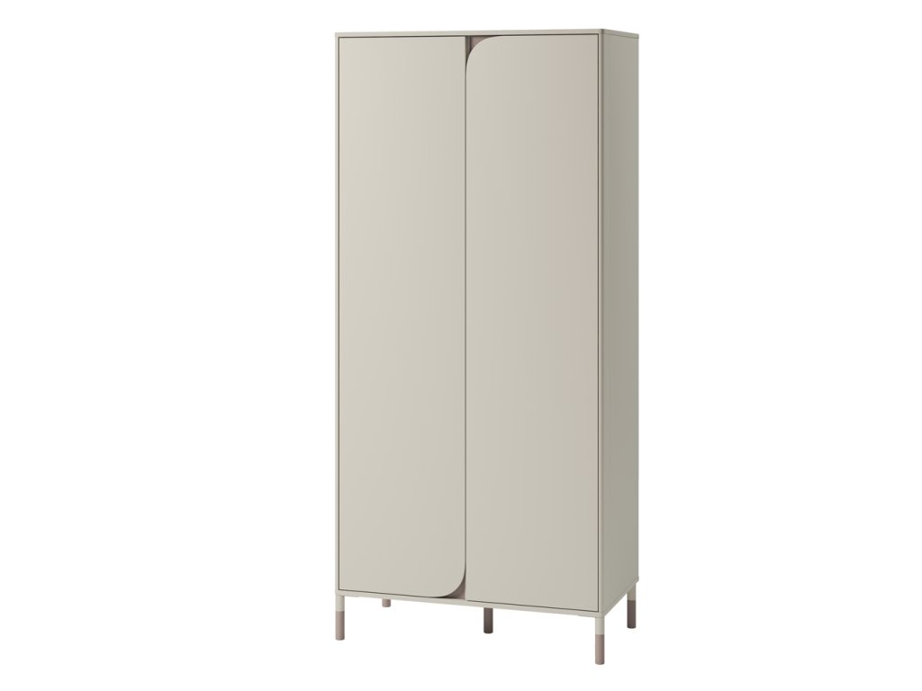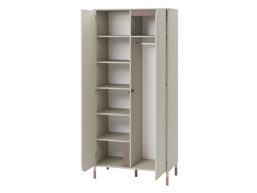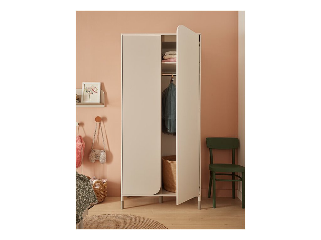 Šatní skříň pro děti i dospělé je praktickým kusem nábytku, jenž napomáhá k organizaci a uskladnění oblečení a dalších osobních předmětů. Šatní skříň rozdělují dvířka na část s policemi a prostor se šatní tyčí k zavěšení oděvů. Tento kousek stojí na vyšších nožičkách, je ozvláštněn o zaoblené rohy a je zhotovený v příjemném odstínu, jenž nenaruší design pokoje.