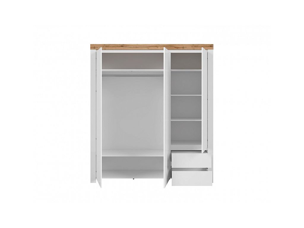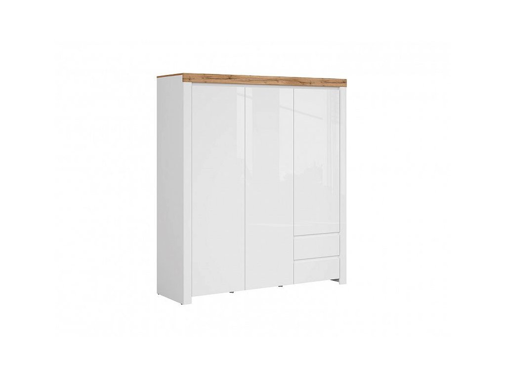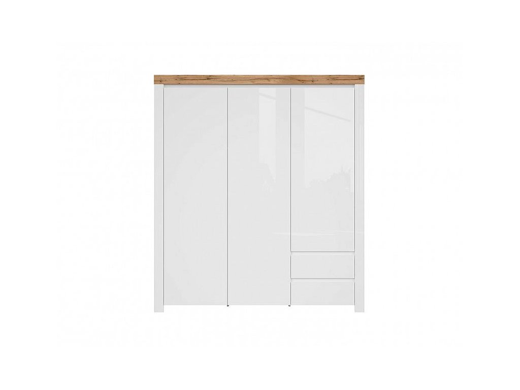 Třídveřová šatní skříň disponuje úložným prostorem v policích, zásuvkách a nechybí ani šatní tyč k zavěšení oděvů. Skříň může stát samostatně nebo s dalším nábytkem ze stejnojmenné kolekce.