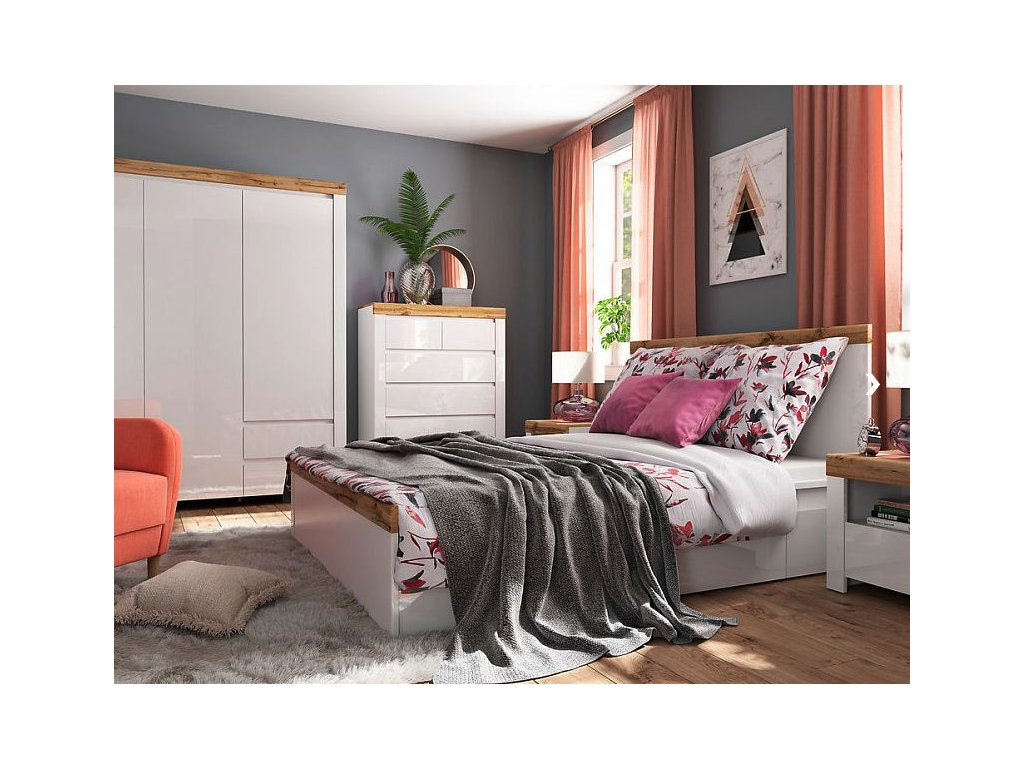 Nábytek je v kombinaci barev - bílá + dub woltan + bílý lesk, tedy světlý odstín s oblíbeným dřevěným prvkem, jež tvoří originální vrchní desku na každém kousku. Lesklá dvířka doplňují matné části a přidávají nábytku na luxusním vzhledu.