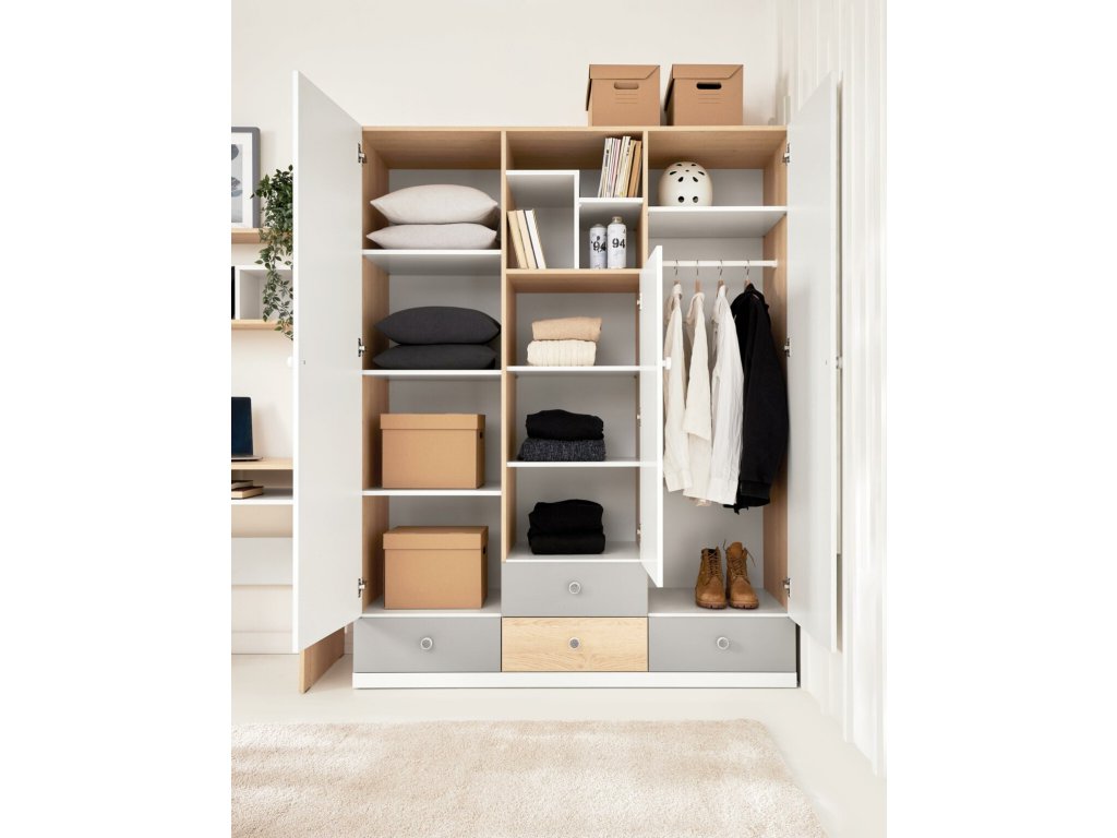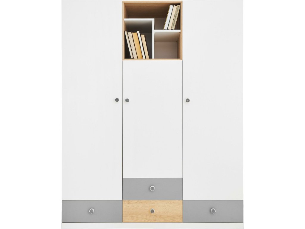 Třídveřová šatní skříň nabídne dostatek prostoru pro uskladněné oblečení, hraček, obuvi a dalších věcí. Díky prostorným policím, šatní tyči a zásuvkám budou věci ve skříni přehledně uspořádané. Ve středu se nacházejí otevřené police na knihy či bytovou dekoraci. Skříň je v neutrálním barevném provedení, jež se hodí do dětských pokojů i ložnic dospělých. Celkový vzhled je doladěný dřevěnými úchyty.