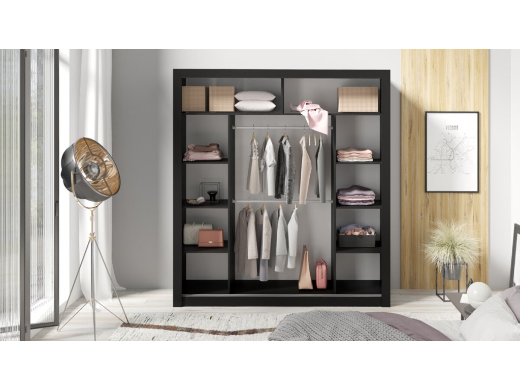 Předností tohoto kousku jsou posuvné dveře, které při otevření nepřekážejí v prostoru a to ocení především ti, kdo mají menší prostory v místnosti nebo chtějí využít skříň v užší chodbě. Uprostřed je připevněné praktické zrcadlo, jež opticky zvětšuje pokoj.