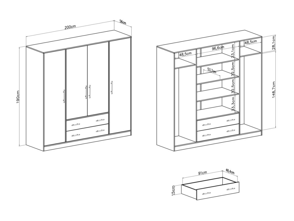 Čtyřdveřová šatní skříň disponuje prakticky rozděleným prostorem. Za krajními dvířky jsou umístěné šatní tyče k zavěšení oděvů, nad nimiž je police. V prostřední části nad oddělenými zásuvkami jsou prostorné police. Ve skříni je dostatek prostoru na velké kousky oblečení, zároveň v ní nechybí místo na drobnosti a vše tak bude přehledně uspořádané. Skříň může stát samostatně v různých pokojích nebo společně s dalšími skříněmi z kolekce Smart. Ke skříni lze zakoupit nástavec, jež poskytne další uzavřené police pro ještě více místa.