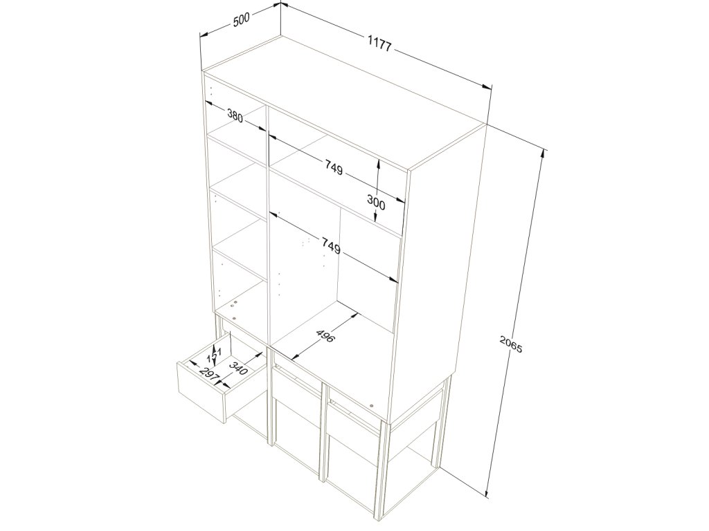 Díky systému push-to-open je skříň zcela bez úchytek – otevírá se jemným dotykem. Pro vyšší stabilitu je vybavena nástěnnými držáky, které umožňují bezpečné ukotvení ke zdi a chrání před převrácením.