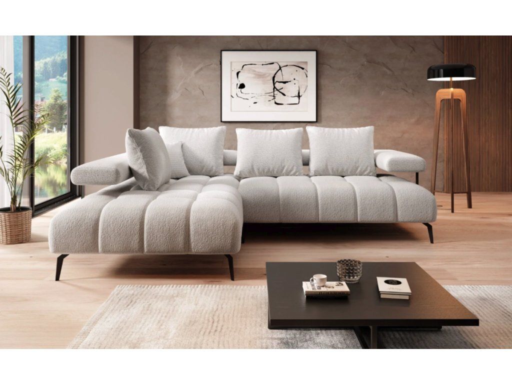 Sedací souprava Magnetic L zaujme čistými liniemi, vzdušným provedením a výraznými detaily. Ozdobné čtvercové prošití sedáků s dvojitým švem podtrhuje precizní zpracování, zatímco zadní část opěráku uchycená na černých kovových pásech dodává soupravě originální vzhled a nádech luxusu.