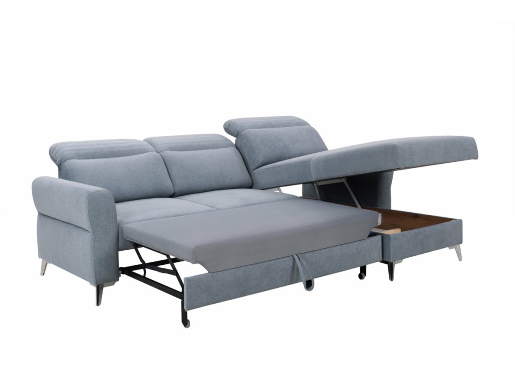 Sedací soupravu lze využít i na občasné přespání, jednoduchou manipulací lze rozložit na lůžko. Nechybí ani praktický úložný prostor pro uskladnění lůžkovin nebo sezónního oblečení.