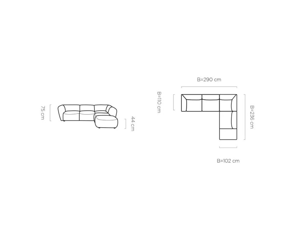 Sedací souprava Candelo L 80 má šířku 290 cm a celkovou hloubku 236 cm.