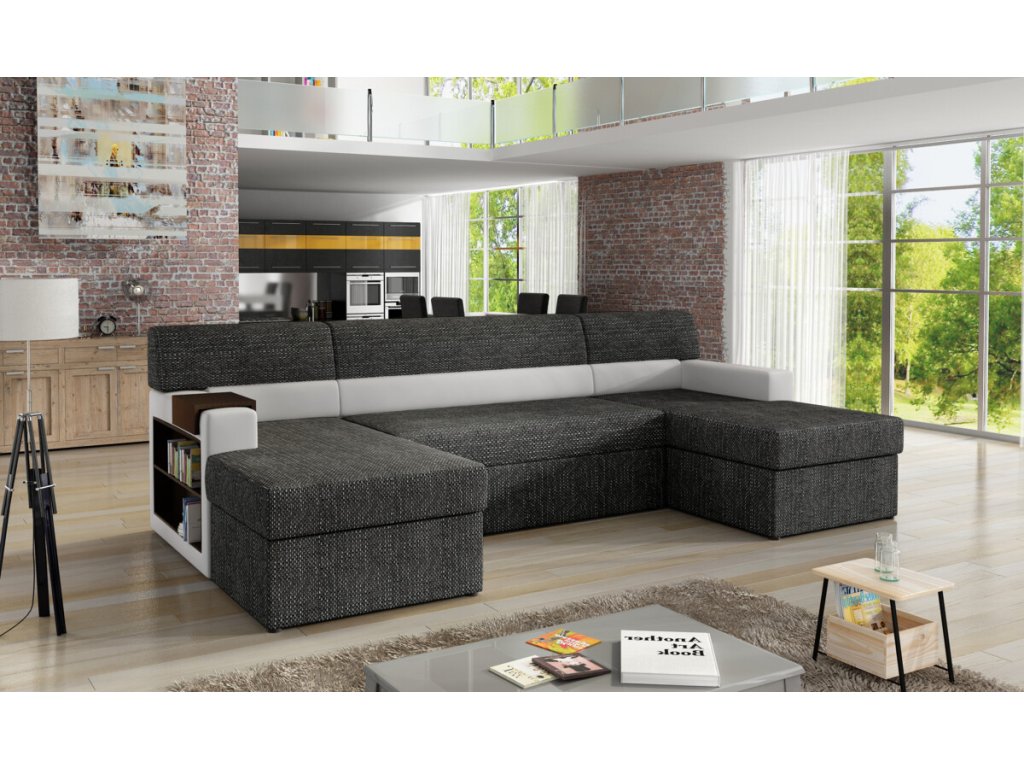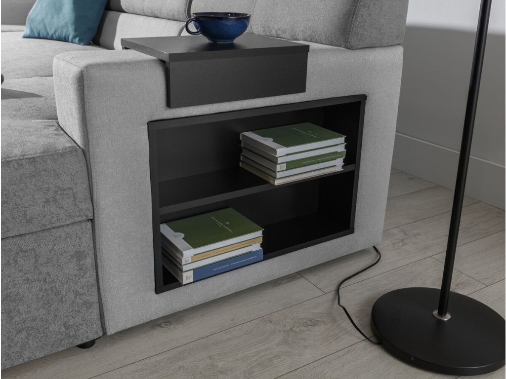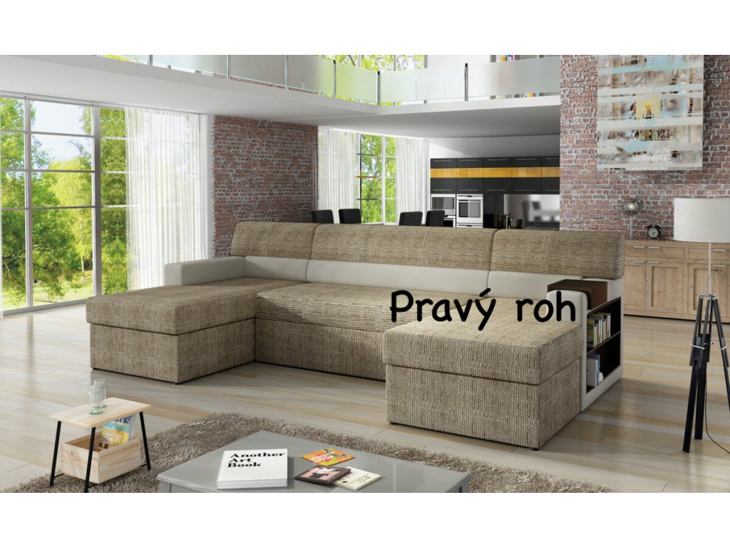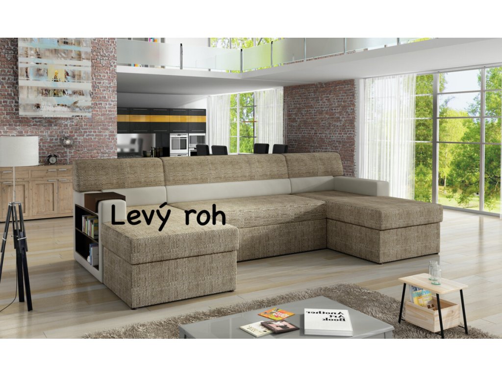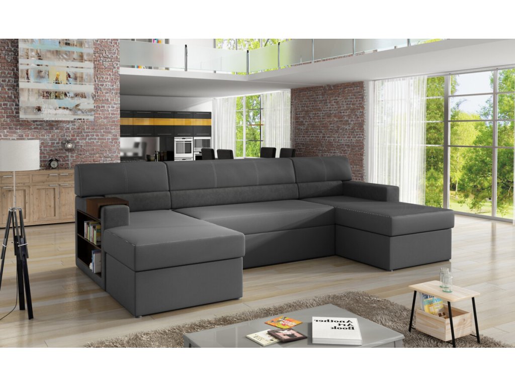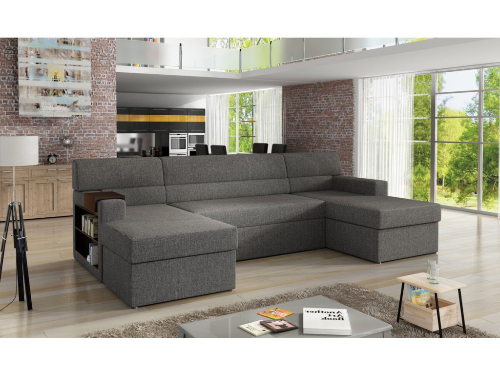 Nevšední sedací souprava Markos je na výběr ve velkém množství látek a odstínů. Zvolit můžete jednu látku na celou sedací soupravu nebo nakombinovat dvě různé. V boku područky je dřevěná police, jež slouží jako knihovna či vytrína na uložení drobnějších věci a dekorace. Na područce je umístěná dřevěná podložka na odkládání nápojů. Sedací souprava má dva praktické úložné prostory a lze snadno rozložit na lůžko 125 x 275 cm. Pohodlí při sezení zajistí kvalitní polyuretanová pěna.