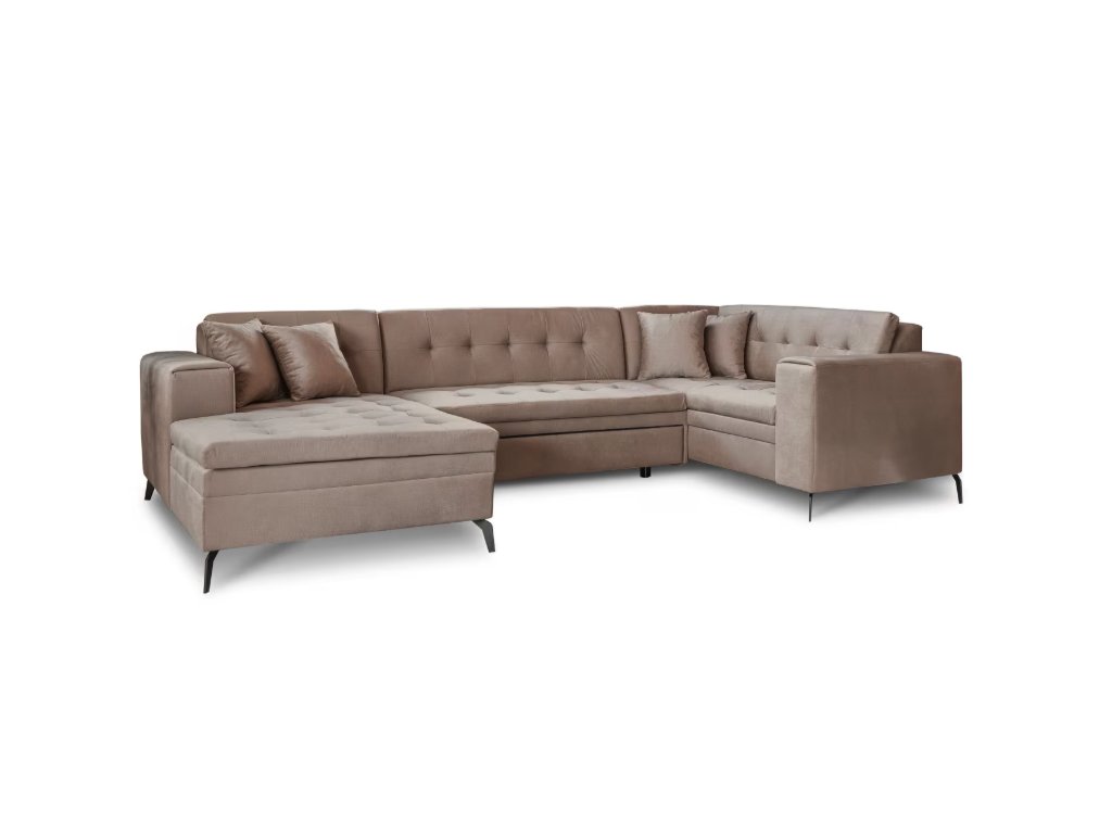 Elegantní a velmi prostorná sedací souprava bude středem pokoje a místem k odpočinku. Tento nevšední kousek sedacího nábytku stojí na vyšších nožkám v černém odstínu, má decentně prošité sedadlo i opěradlo a nabízí možnost rozložení na lůžko pro občasné přespání návštěvy či lenošení u televize. Jsou to právě vyšší nohy, díky kterým působí vzdušně, přestože se jedná o rozměrný kus. Pohodlné sezení pro více lidí zajišťuje kvalitní polyuretanová pěna a vlnité pružiny. Sedací soupravu lze umístit do jakéhokoli interiéru, stačí jen vybrat vhodnou látku na potah, na výběr je velké množství.