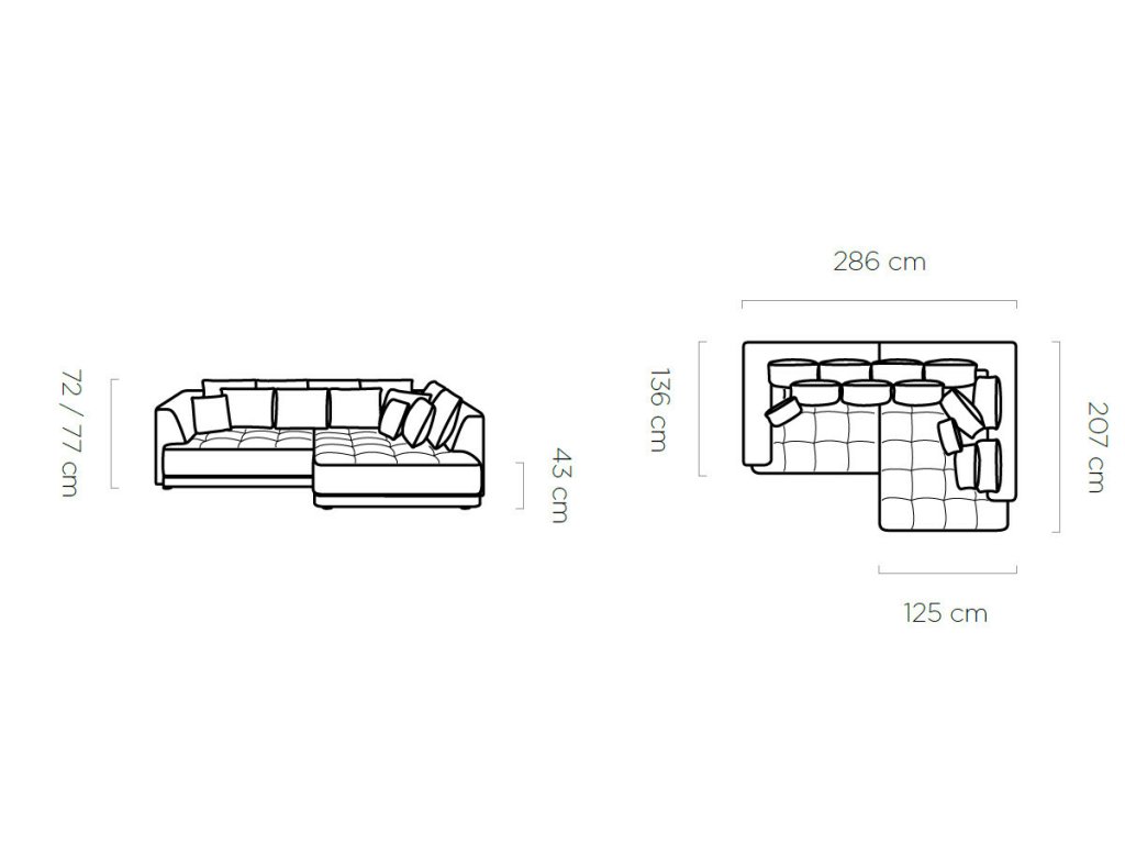 Rozměrná sedačka šířky 285 cm a hloubky 205 cm zaujme svým širokým otomanem o šířce 135 cm a precizním zpracováním v každém detailu.