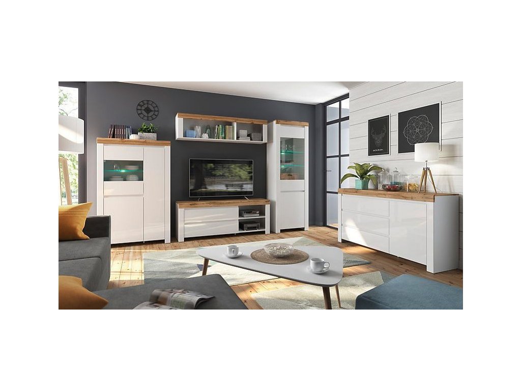 Nábytek je v kombinaci barev - bílá + dub woltan + bílý lesk, tedy světlý odstín s oblíbeným dřevěným prvkem, jež tvoří originální vrchní desku na každém kousku. Lesklá dvířka doplňují matné části a přidávají nábytku na luxusním vzhledu.