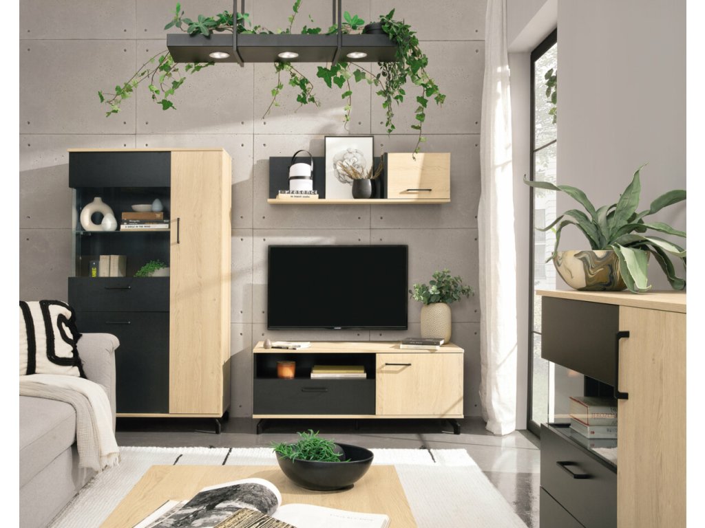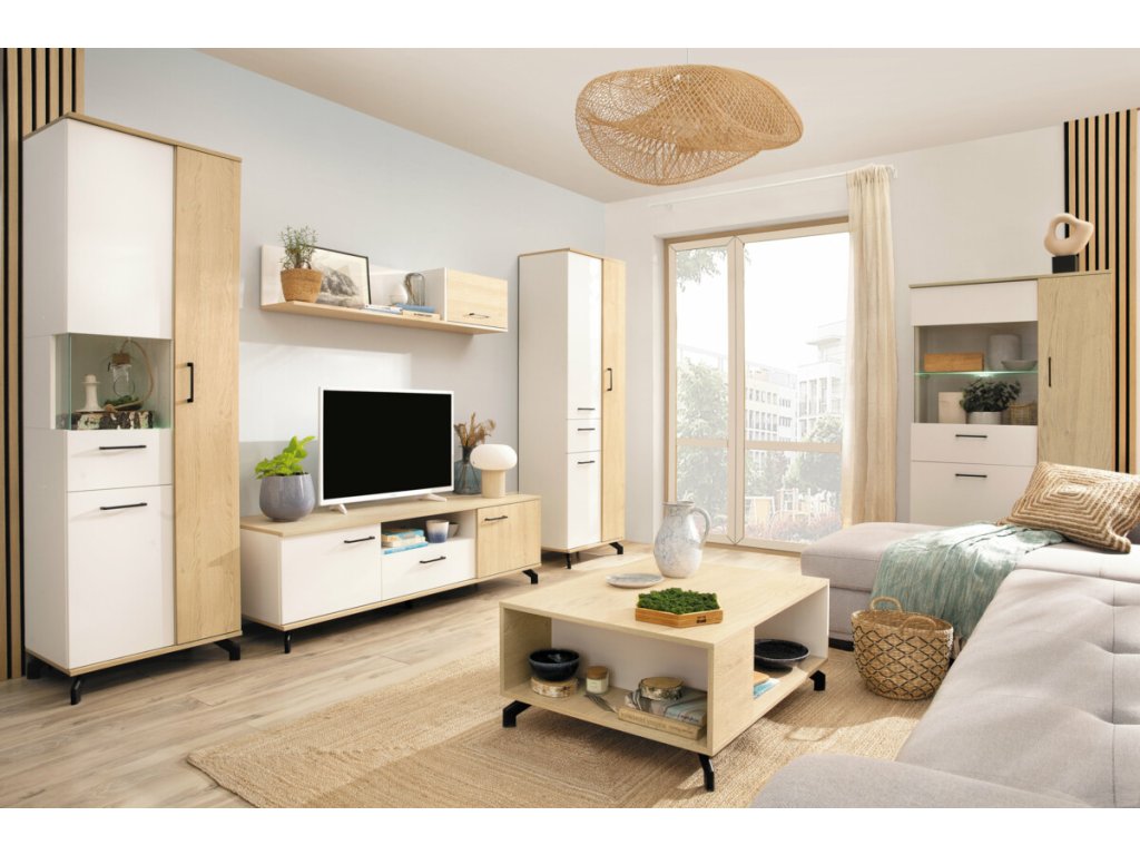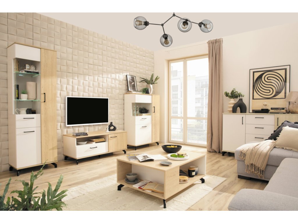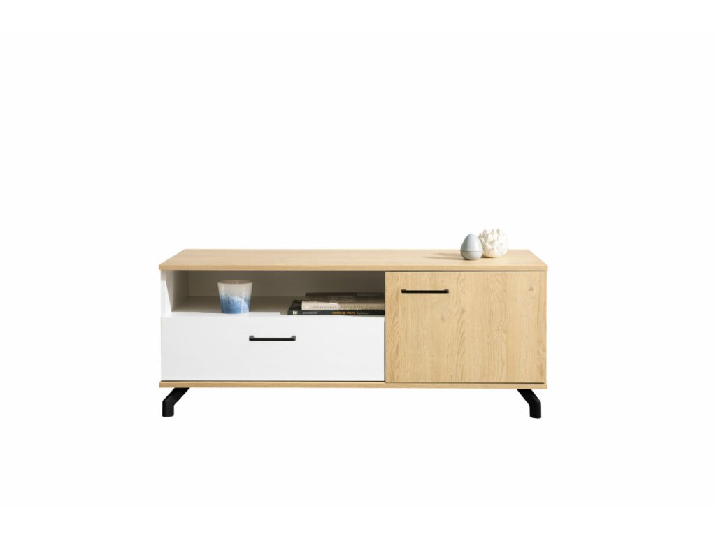 Stolek se zásuvkou, otevřenou policí a dvířky slouží k odkládání a uskladnění různých drobností, jako jsou časopisy nebo ovladače na televizi. Stolek se hodí do všech místnosti a je praktickým kouskem s víceúčelovým využitím.