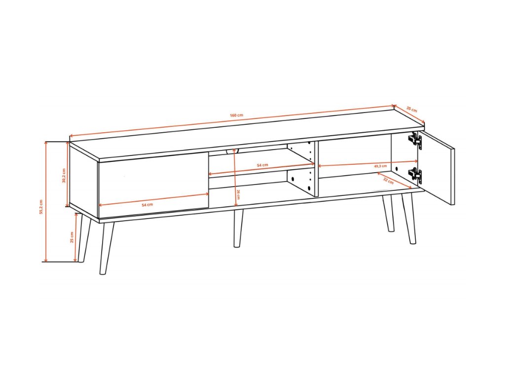 Stolek je rozdělený na uzavřené a otevřené police, jež poskytují úložný prostor na různé drobnosti. Na desce stolku může stát televize do maximální velikosti 70". Deska stolu je zároveň perfektním místem pro bytovou dekoraci, svíčky, květiny a osvětlení.